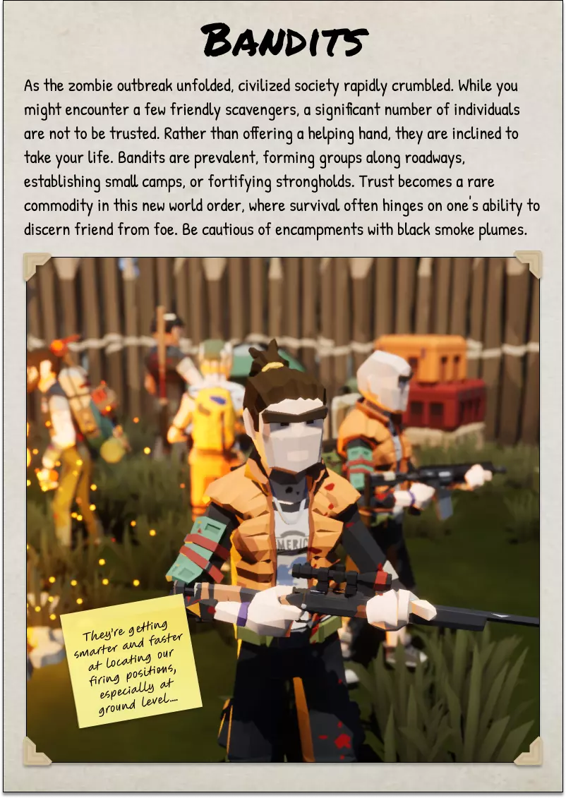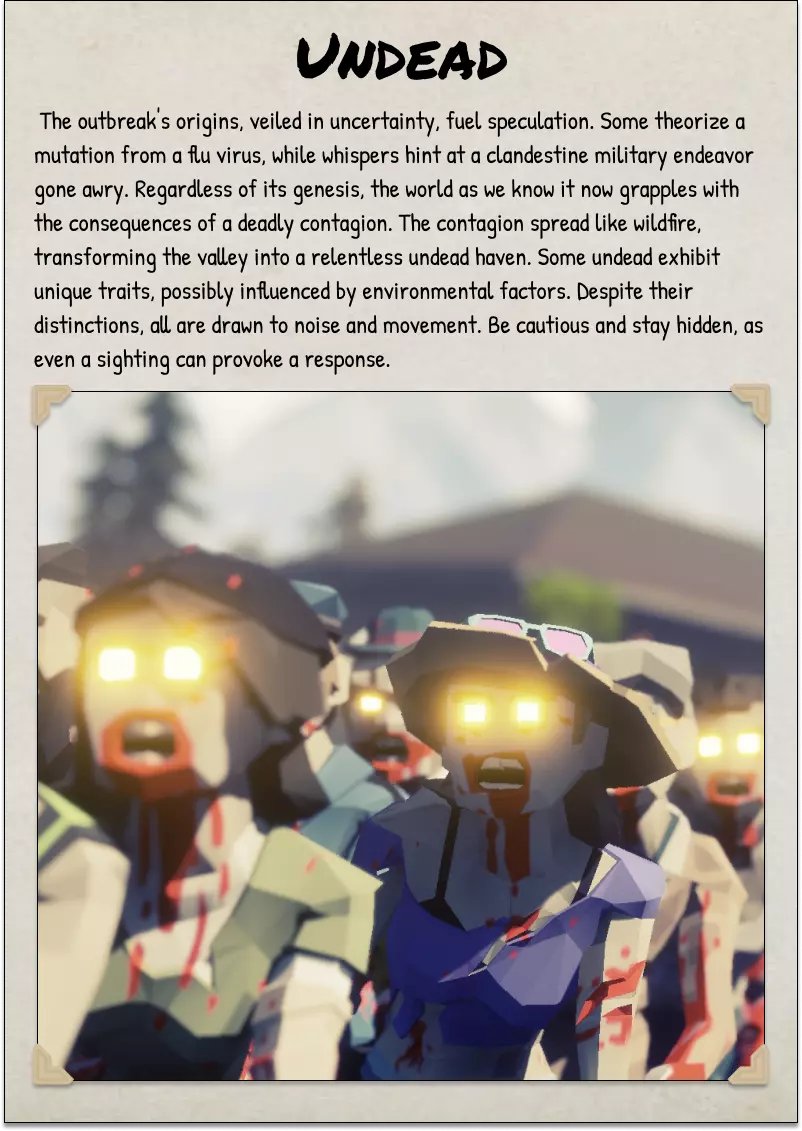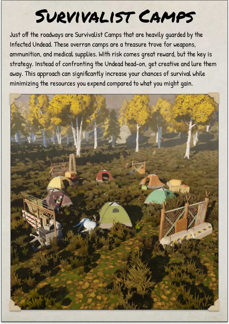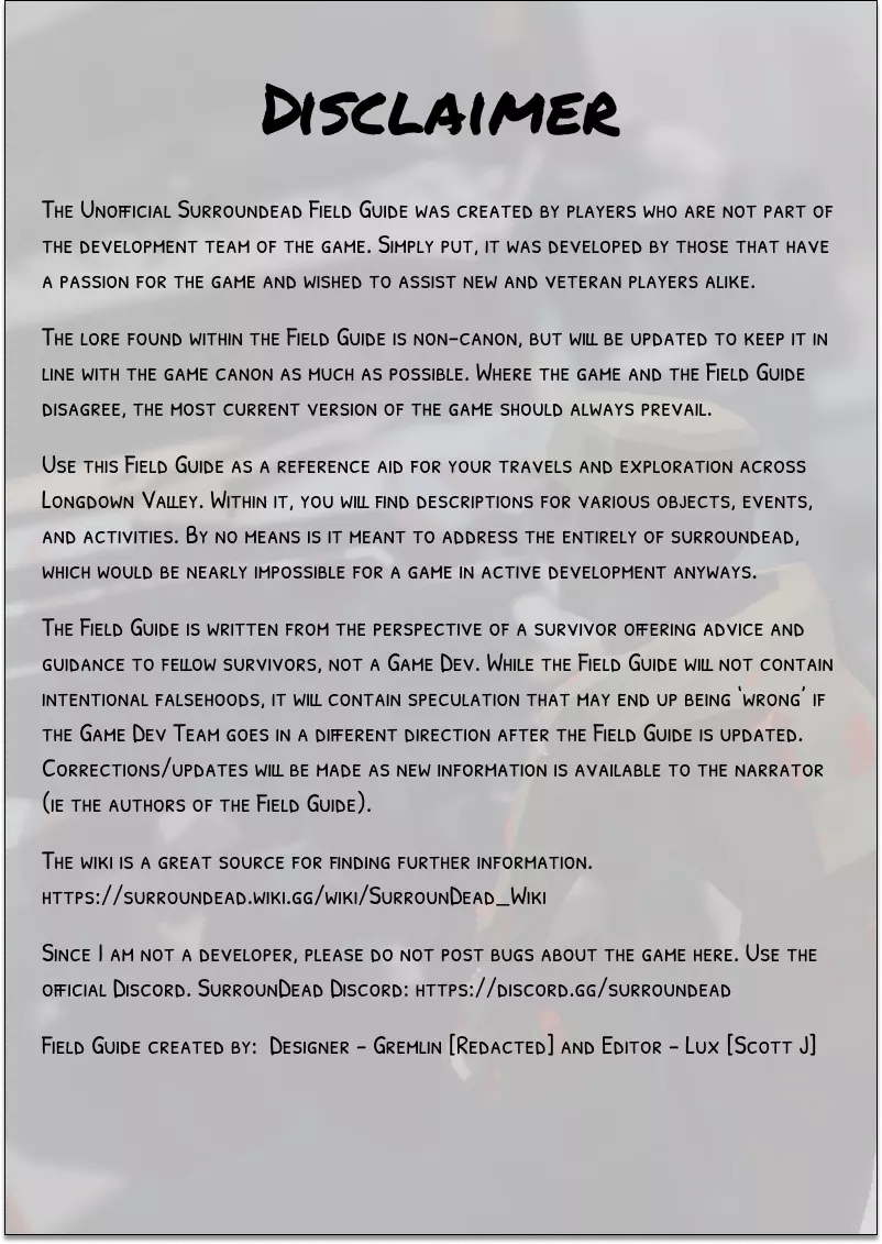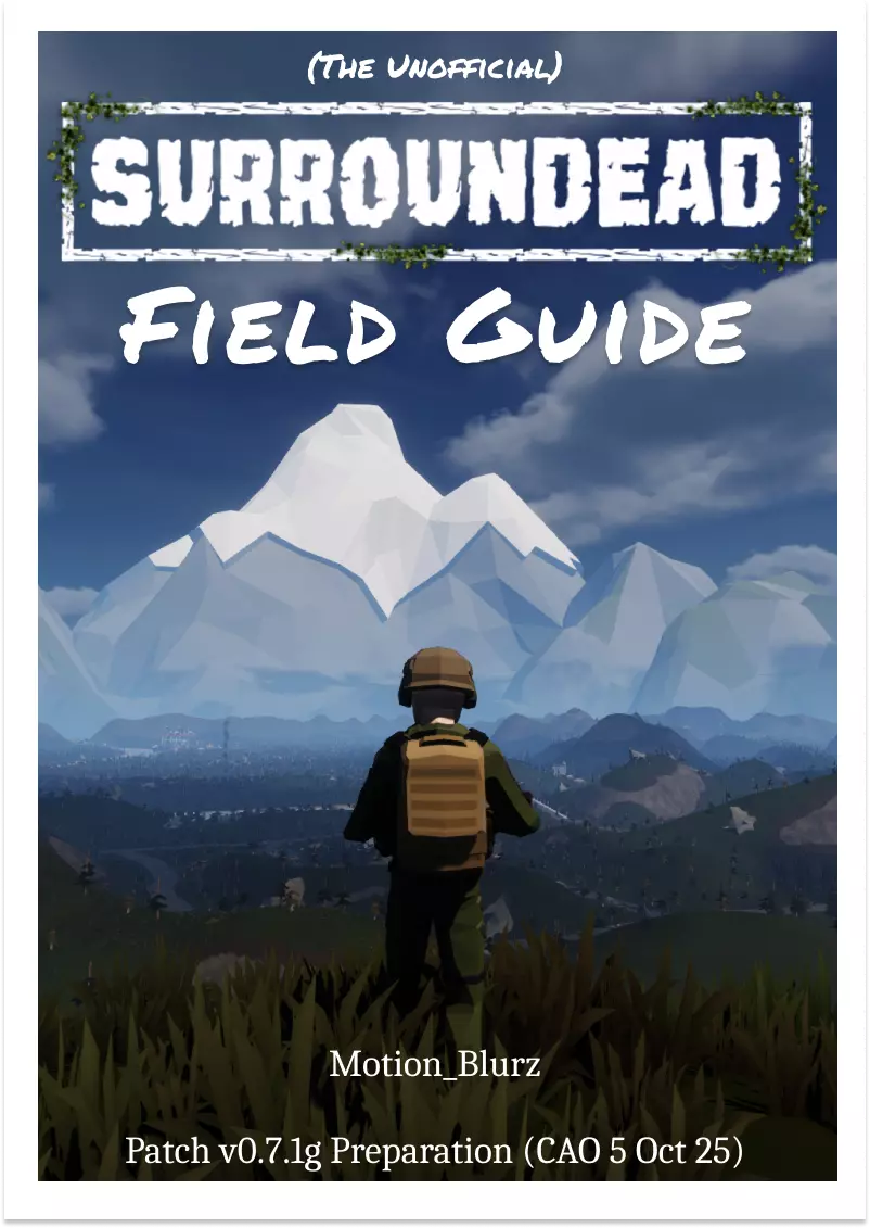 2025年10月5日 CAO 《SurrounDead》非官方朗当谷野外指南由与该游戏开发方无关的玩家制作。本指南由热爱这款游戏的玩家开发和维护,旨在帮助新老玩家。 将本野外指南作为你在朗当谷旅行和探索的参考工具。其中包含各种物品、事件和活动的描述。 指南中的背景故事为非官方设定,但会尽可能根据游戏官方设定进行更新。 封面页