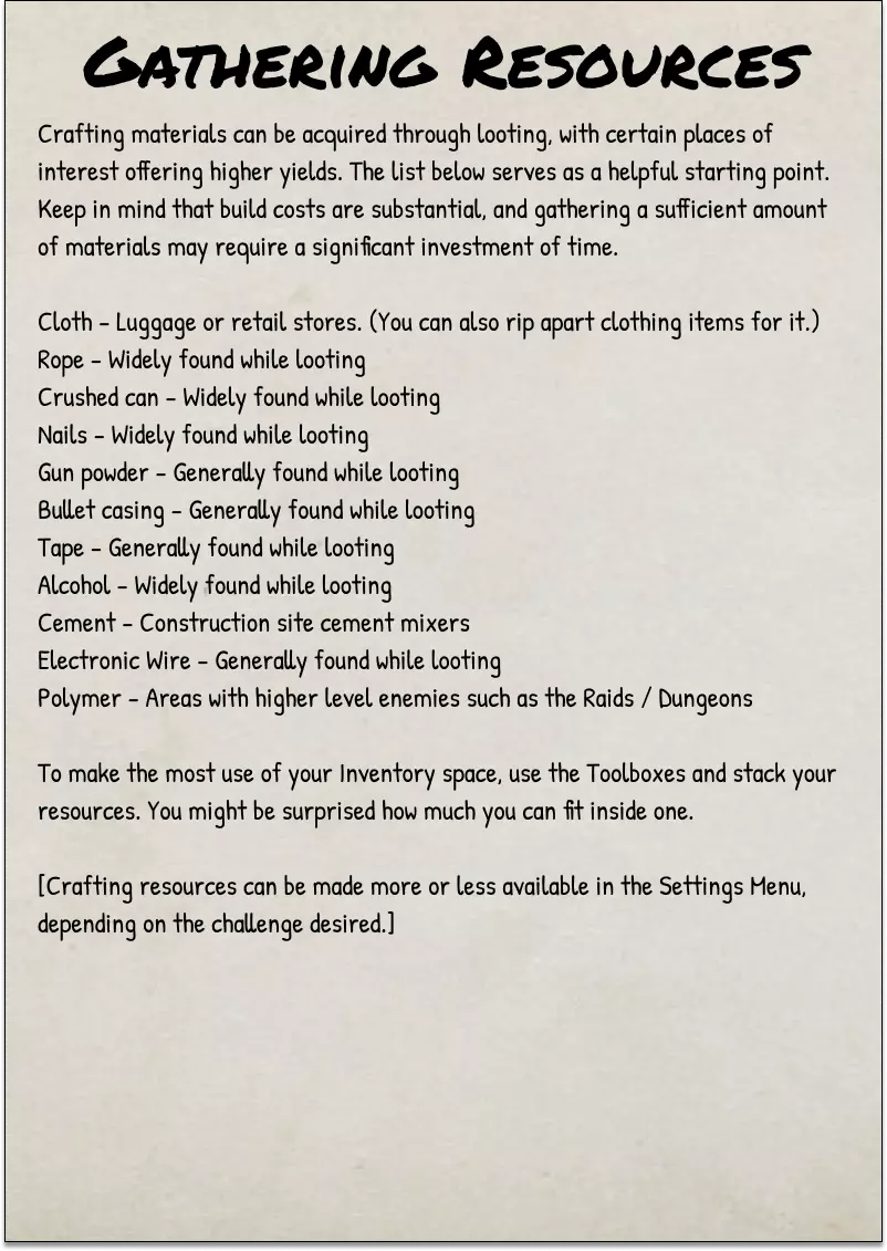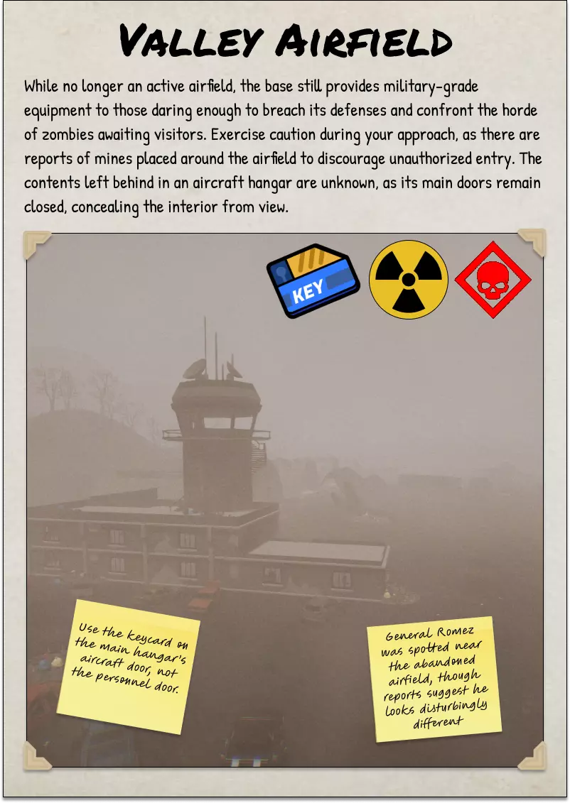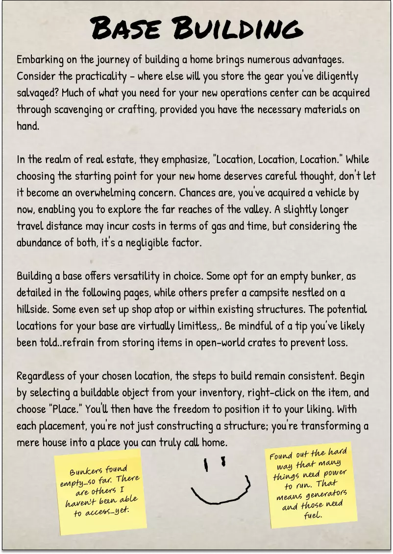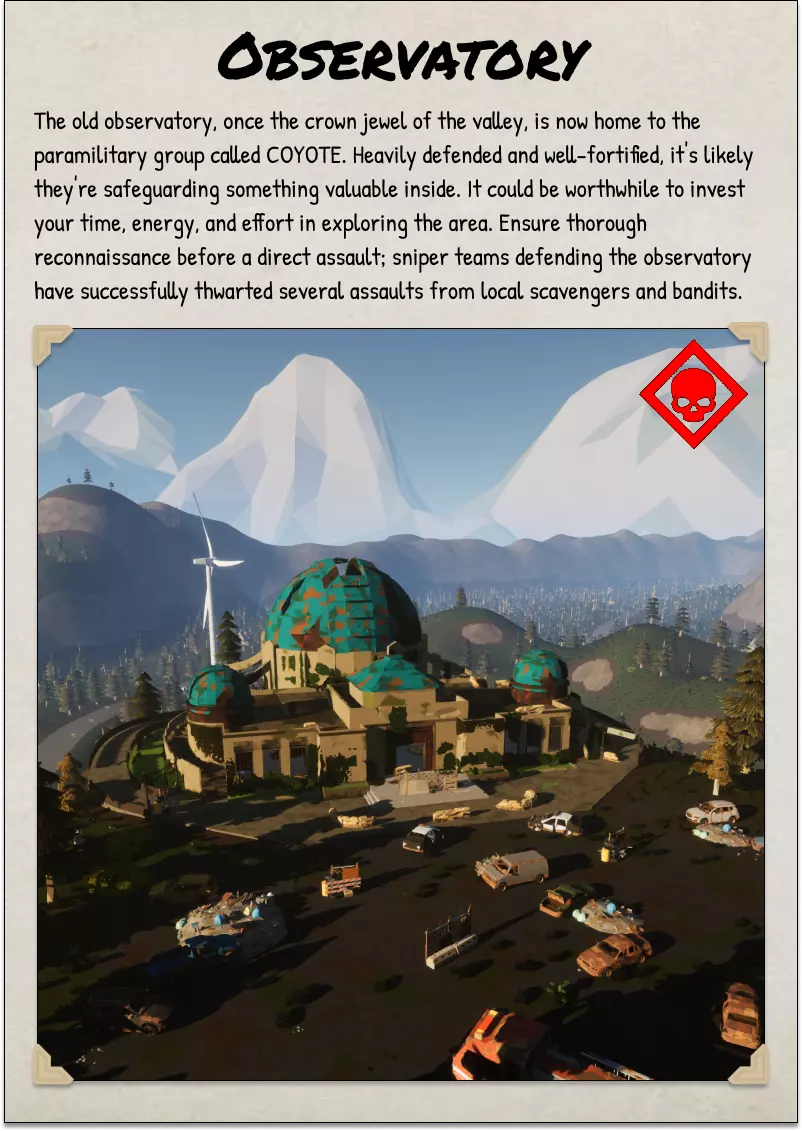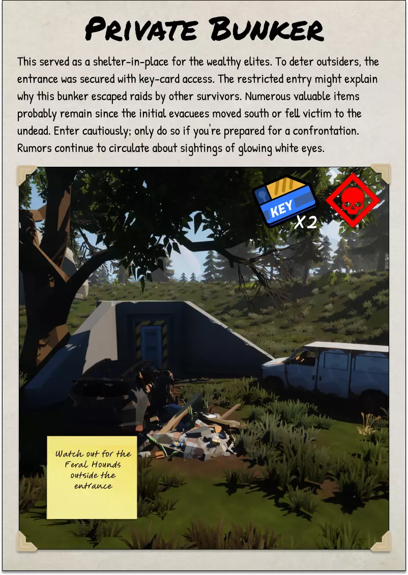 2025年10月5日 CAO 《SurrounDead》非官方朗当谷野外指南由与该游戏开发方无关的玩家制作。本指南由热爱这款游戏的玩家开发和维护,旨在帮助新老玩家。 将本野外指南作为你在朗当谷旅行和探索的参考工具。其中包含各种物品、事件和活动的描述。 指南中的背景故事为非官方设定,但会尽可能根据游戏官方设定进行更新。 封面页