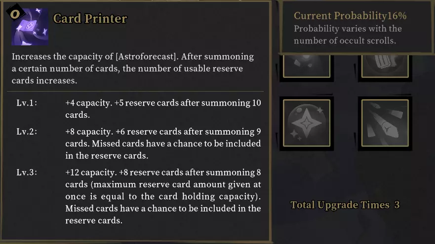 围绕次要技能构建的【卡牌】专精对高品质【神秘卷轴】有较高需求。通过【战略思维】的升华,可从频繁获取的高品质【星象】中获得技能伤害和特殊加成。