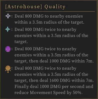 紫霄会随机获得【星象】直至【槽位】填满,随后获得【星宫】。根据【星宫】引导【流星】攻击指定敌人或目标区域,之后清除【星宫】。若【星象】品质相同,可分为【普通/稀有/传说/野生星宫】;若【星象】品质不同,则会成为无任何特殊加成效果的【不纯星宫】。【星宫】品质越高,引导的【流星陨落】在伤害、范围等方面的效果就越好。图示如下: