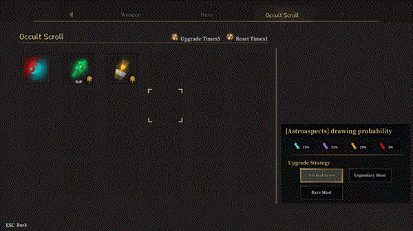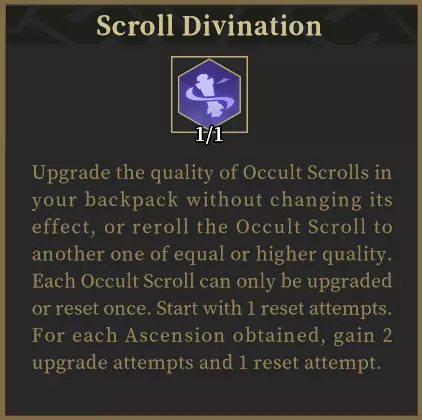 【卷轴占卜】是紫霄的核心天赋,该天赋为他带来两项能力:【秘奥卷轴强化】与【秘奥卷轴重置】。玩家可在安全区域打开背包,或在队伍界面直接按下C键,自由改变秘奥卷轴的品质。这能让玩家改变获取不同品质【星相】的概率,进而进一步影响紫霄的战斗力。