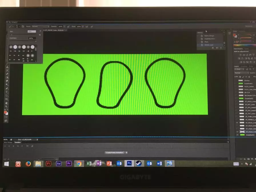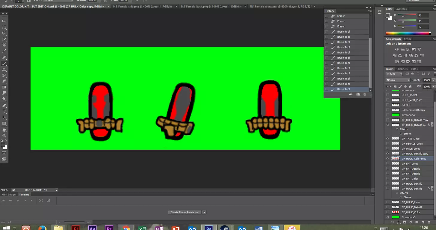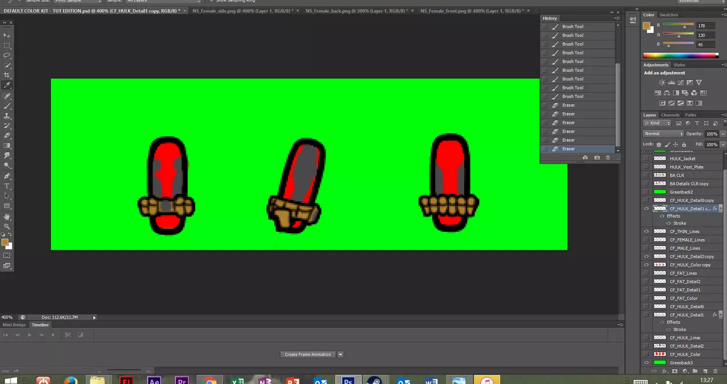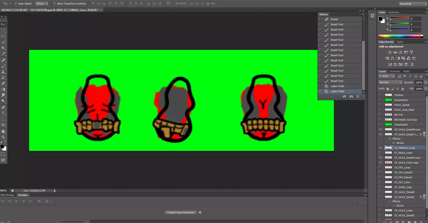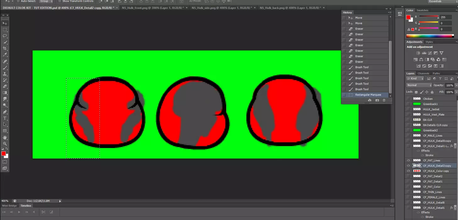 其次,请确保你的图层排列正确。 你会在附图中注意到,在CF_HULK_Lines图层下方有不同的颜色和细节图层。 在这个案例中,我们首先绘制绿巨人的身体轮廓,因此必须在轮廓图层下方创建一个颜色图层,颜色图层上方是一个细节图层,根据你想要的细节程度,还可以添加额外的细节图层。 我不喜欢将所有细节和颜色都放在一个图层中,因为这会使批量处理这些服装变得非常困难。 来自Flash动画环境的经验告诉我,这是一种能让你尽快完成工作的非常重要的技巧。