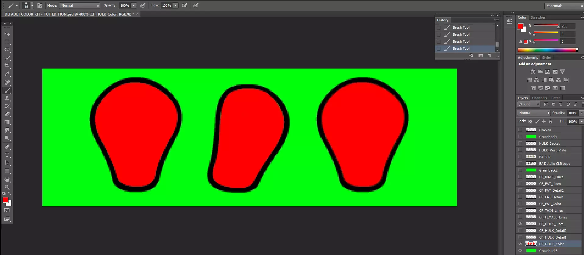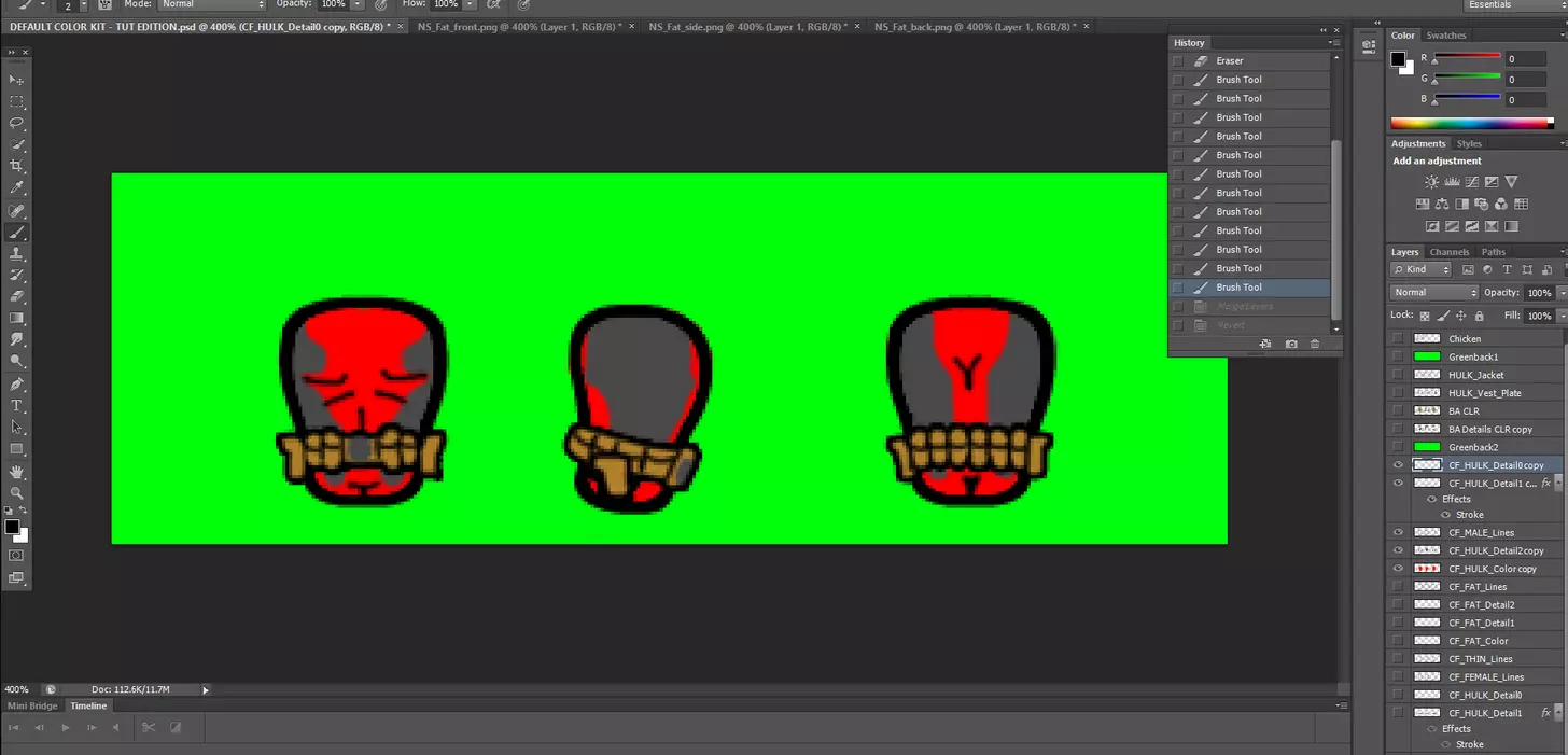 1. 永远不要抄袭他人作品并将功劳据为己有,功劳属于谁就该归功于谁 2. PNG图片具有透明效果 3. 最终作品务必以PNG格式导出 4. 务必保存备份文件并经常保存 5. 犯错是正常的,重要的是你能多快适应并纠正错误,而非追求完美 6. 撤销按钮和历史记录标签就像时光旅行,犯错时不必惊慌 7. 尺寸越大,可容纳的细节就越多 8. 尺寸越小,可容纳的细节就越少 9. 总会有人注意到错误并提出不满 10. 建设性的批评比赞美更有价值 牢记以上这些,就可以开始实际工作了 绿巨人身材类型 打开要求页面中附带的PSD文件。(除非你希望制作自己的默认预设。)就我个人而言,我会从【绿巨人】体型开始。我建议从【绿巨人】或【肥胖】体型开始,因为在这些体型上你可以添加最多的细节,而其他较小的体型之后只需要删减细节即可。