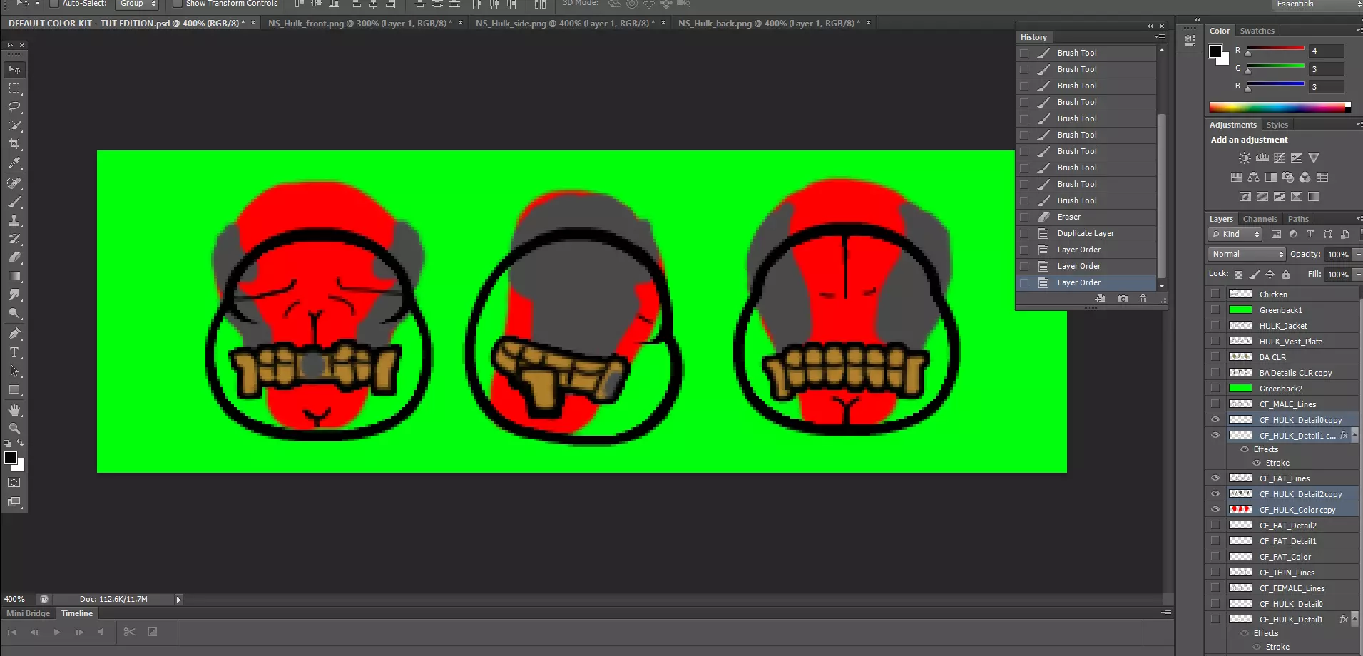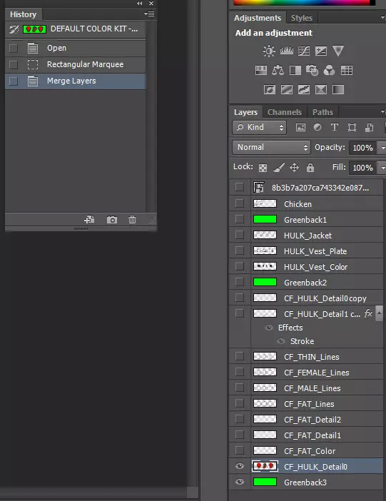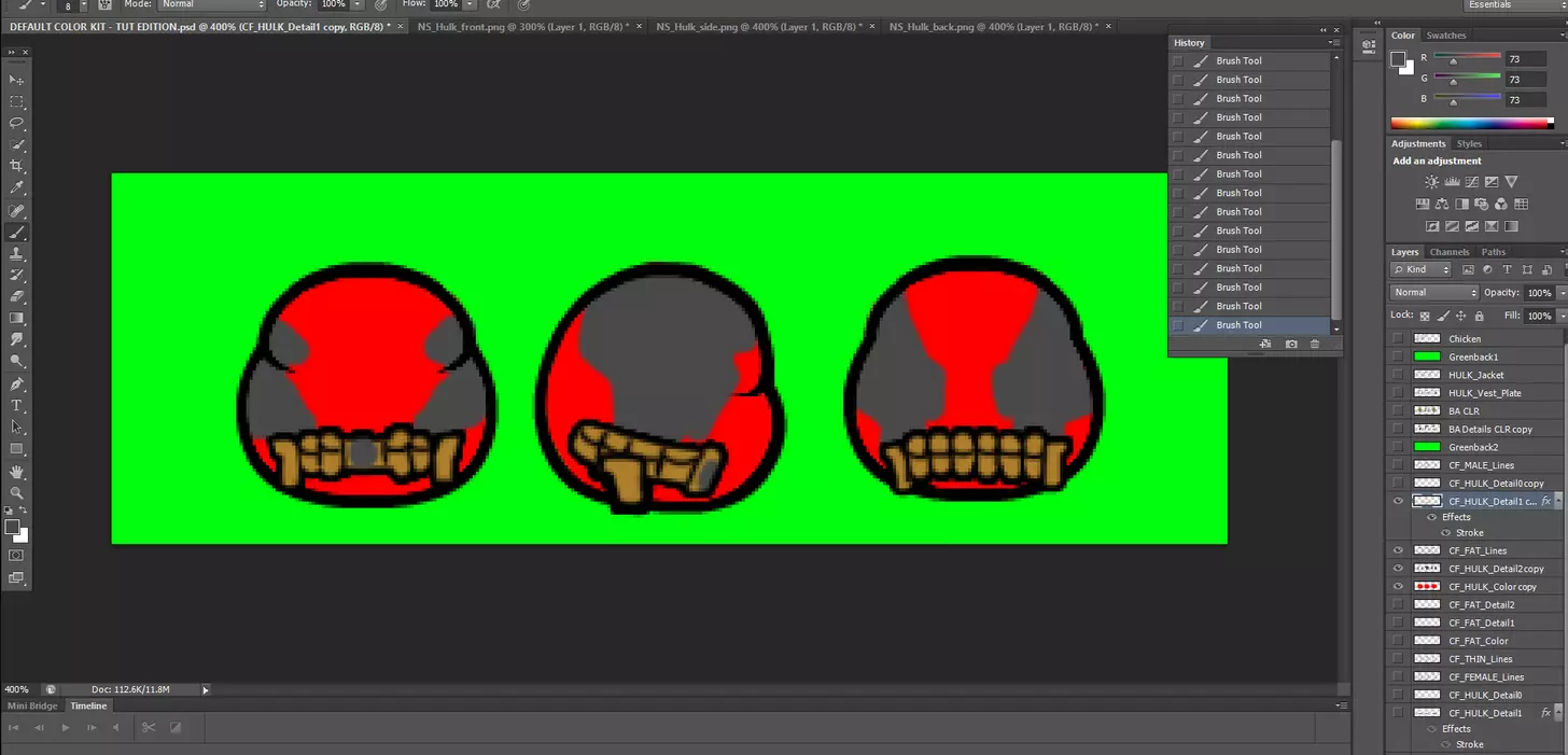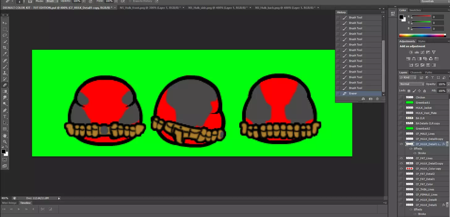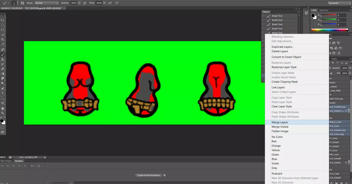 好了,我们已经完成了这个绿巨人身体类型的制作,现在是时候撤销之前的合并操作,以便为其他身体类型恢复所有图层了。