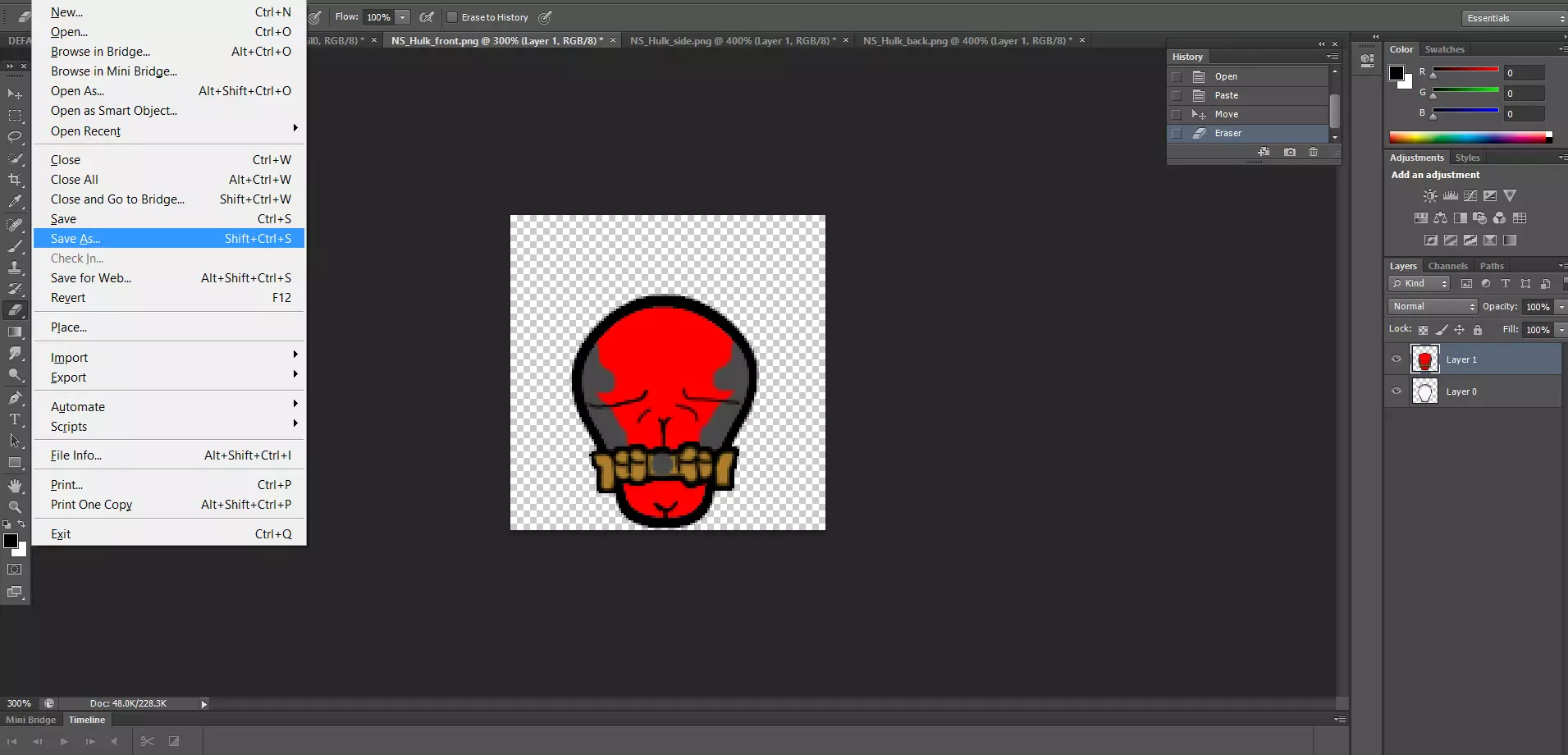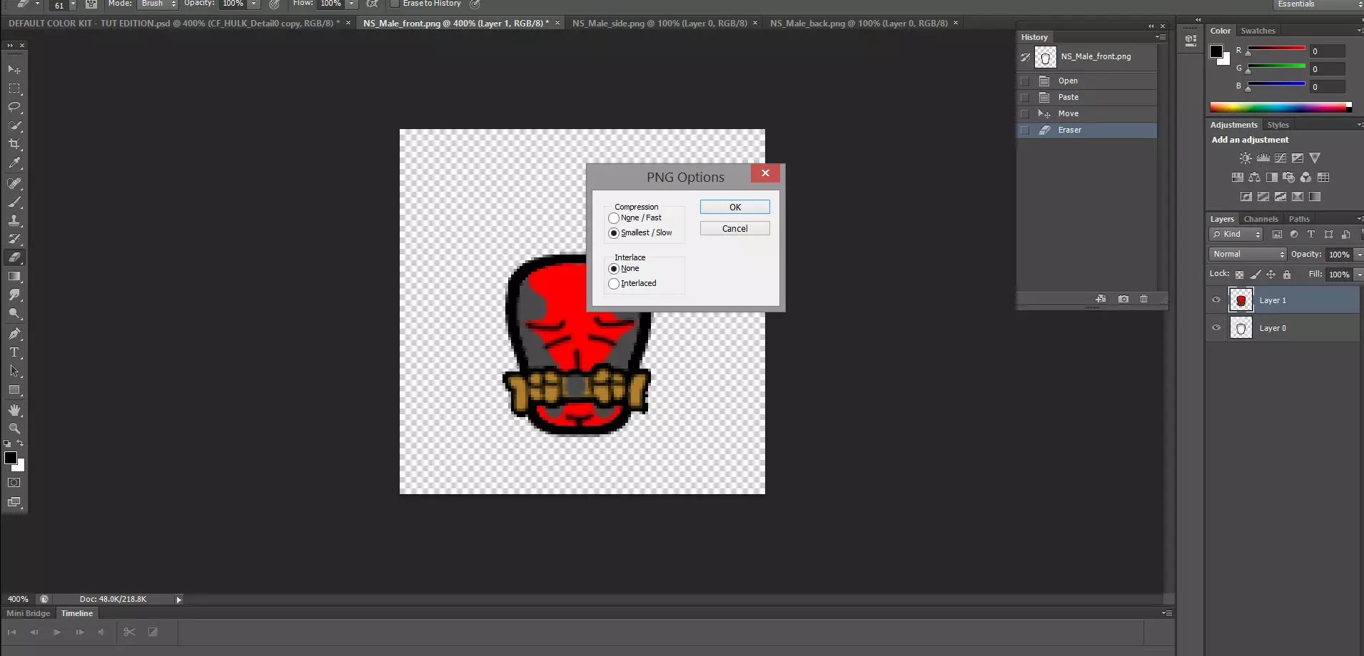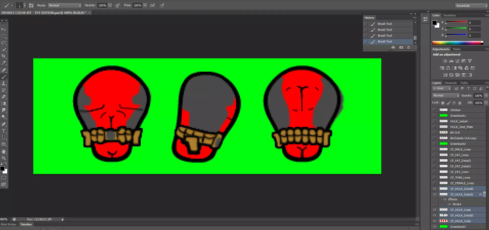 好了,我们已经完成了这个绿巨人身体类型的制作,现在是时候撤销之前的合并操作,以便为其他身体类型恢复所有图层了。