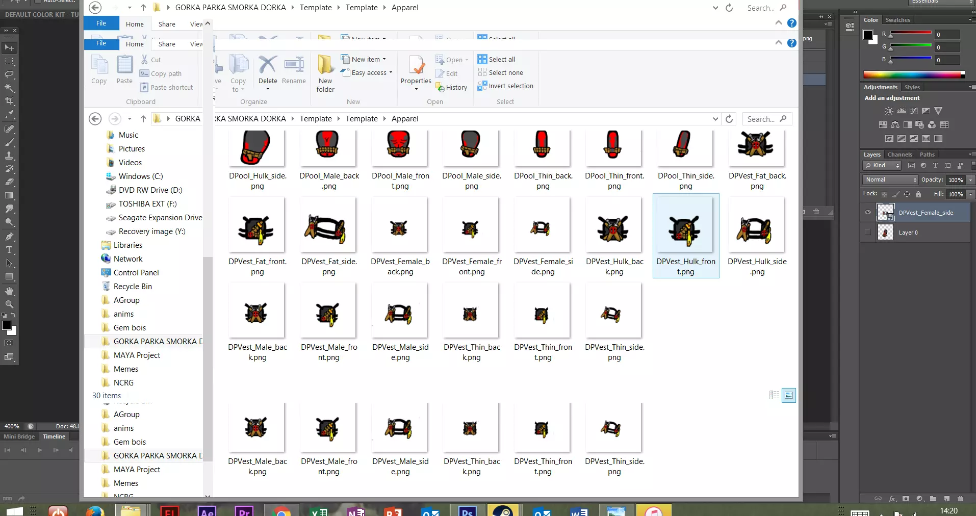 你可以将此原则应用于其他类型的服装,完成后,你保存所有文件的文件夹中应该会有类似这样的内容。 我为我的死侍服装模组制作了额外的配饰,比如头饰和护甲,但我不会在本教程中添加这些内容,因为你可以将此技巧应用于任何物品。 在我附带的文件中,有一个画得很粗糙的护甲背心模板和一个画得很粗糙的夹克模板。如果你觉得自己比我强,并且对我的作品不屑一顾,你完全可以自己制作模板。 如果你想了解服装的编码方式,我在附带的文件中留下了一些笔记。这不是一个正式的教程,但希望能帮助一些人理解服装模组的编码原理。 希望本指南对你有所帮助,批量制作愉快!
