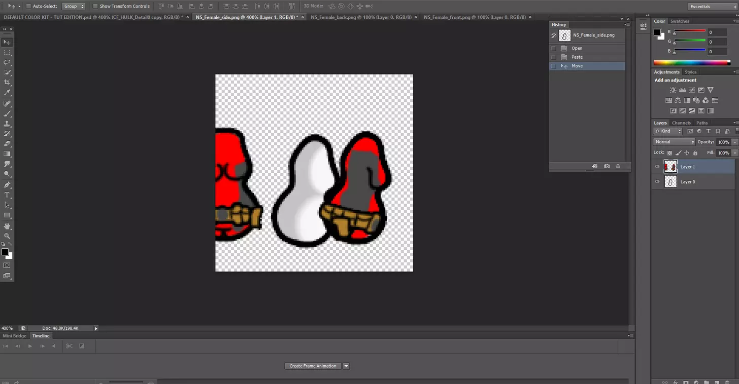 完成其他体型的重复操作后,或许可以为女性体型添加独特细节。(我收到很多关于女性 pawn 有臀部线条等的投诉。) 现在按照处理其他体型的方法合并所有纹理,并使用矩形工具进行复制。