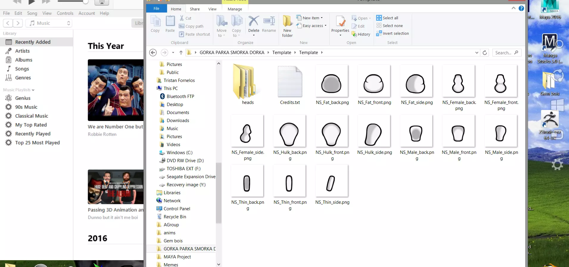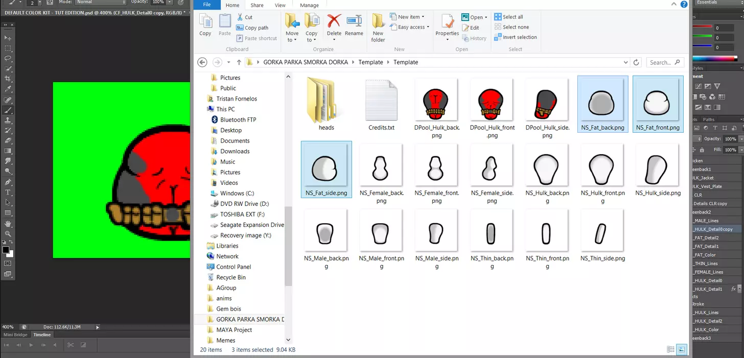 最小化Photoshop,然后在我附带的文件中,有TRP提供的 pawn 纹理,其尺寸和位置完全符合《环世界》pawn 所需的所有正确显示要求。我们需要将所需的三种体型拖入Photoshop中各自的新文档,以便在相应位置对齐我们完成的纹理。
