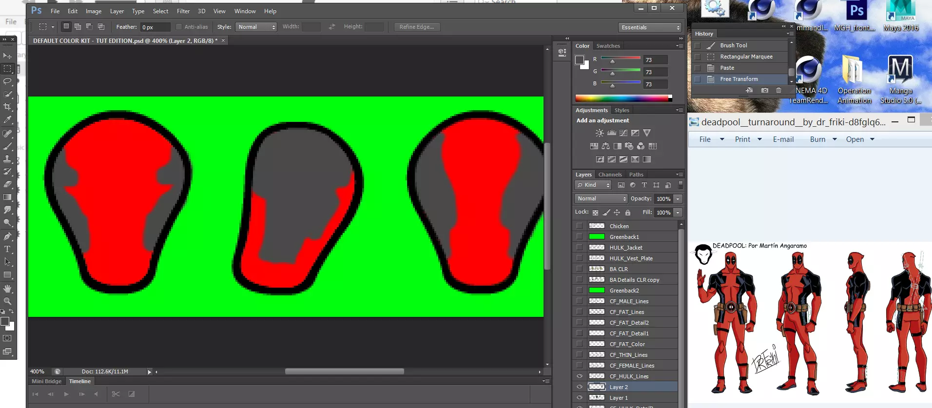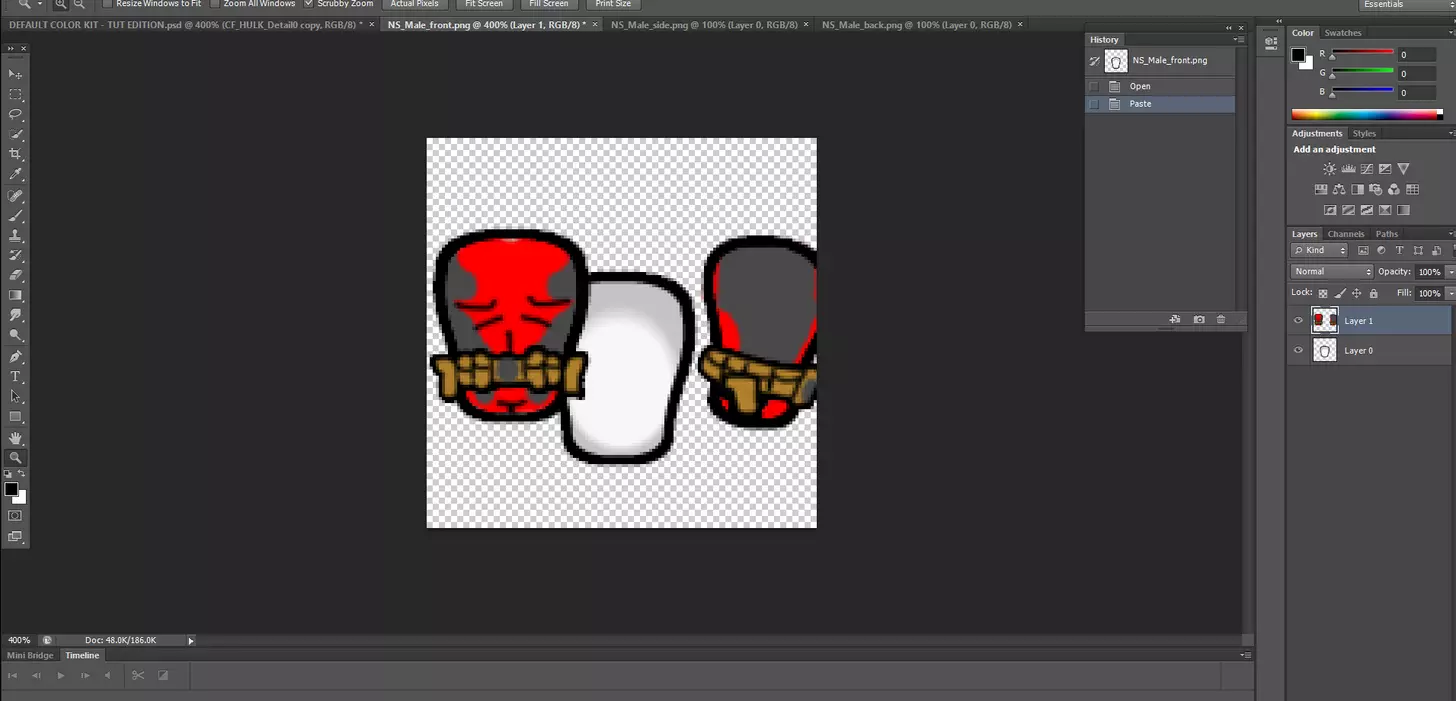 是时候给你的服装上色了,在这个案例中,我正在制作一套死侍服装,颜色会是红色,这样坏人就看不到他流血了。 我从网上找了一张参考图来获取细节,如果你在创作过程中得到了其他艺术家的帮助,一定要记得注明出处。 你可能已经注意到,由于我们是在单独的图层上上色,所以无法使用填充工具。 你小时候用蜡笔给 coloring books 涂色的所有经验现在都要派上用场了,因为你必须努力避免涂到身体线条图层之外。