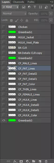 关闭原始绿巨人图层的可见性,现在我们只需要查看复制的图层。相应地移动图层,确保肥胖身体线条位于颜色图层之上,并且任何你希望显示在身体线条下方的细节都处于正确位置。