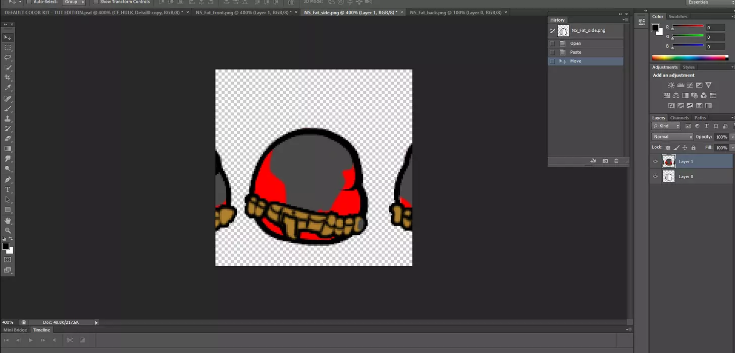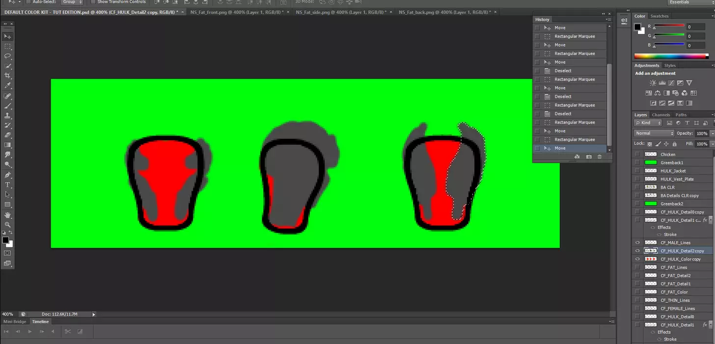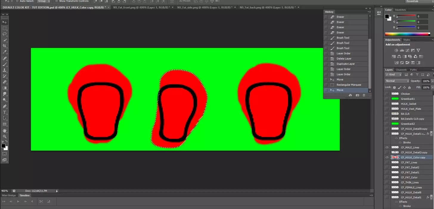 将各部位对齐到其应在的位置,并擦除所有多余的可见纹理,对其他肥胖体型方向重复此过程。 保存为.PNG格式,并确保所有文件命名正确。 接下来处理男性体型。 男性体型 希望你学东西很快,现在应该已经熟悉流程了。 关闭所有已保存和不需要打开的额外文档。返回默认颜色套件的.psd文件。