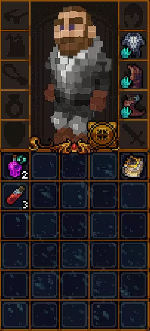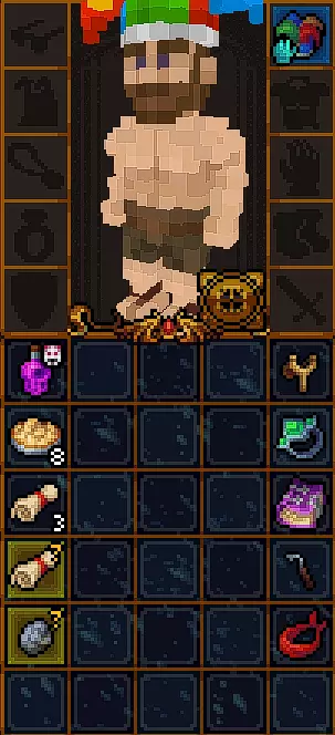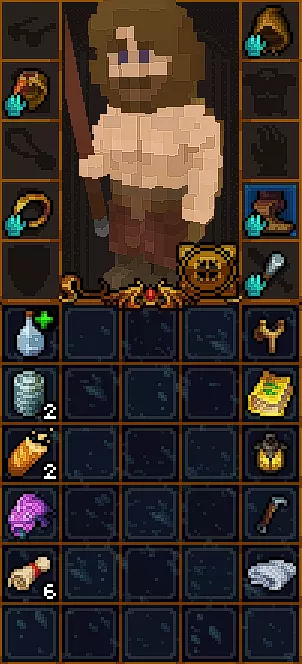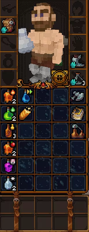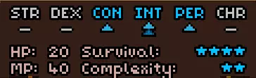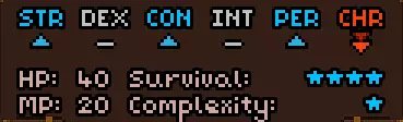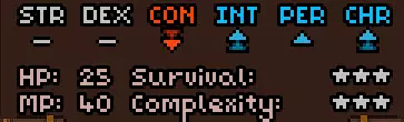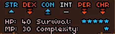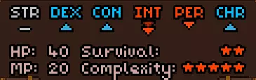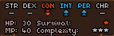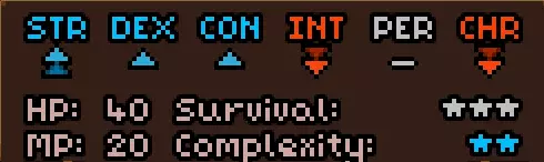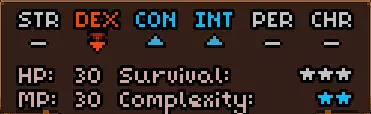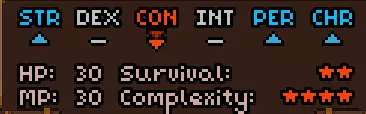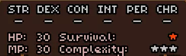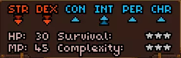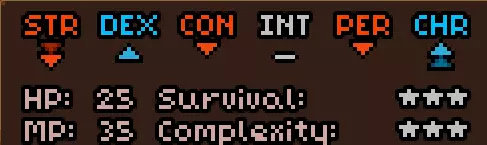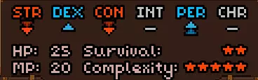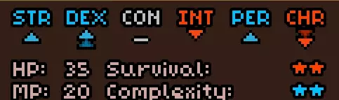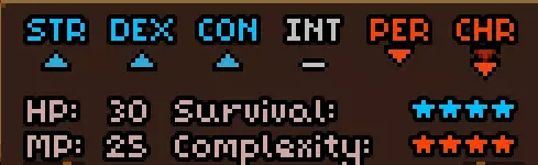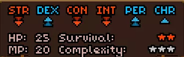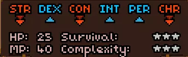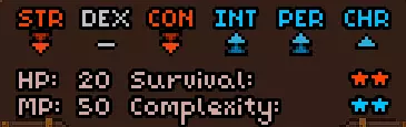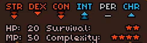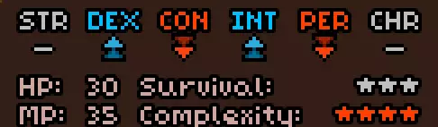 初始时没有法术。 有用的物品包括背包(10个物品栏位,需装备在披风栏位)、大量初始炼金材料,以及炼金台(用于酿造所有药水)。 初始自带的书中包含药水酿造基础提示,但信息较为模糊。在游戏手册【Compenduim】中可以打开所有药水的配方表,操作方法是进入【Codex】标签页,然后找到炼金技能。花费点数后,配方表就会解锁。 开始赛跑后获得25点领导力、10点贸易、10点历史、50点炼金、25点徒手攻击、10点斧头技能。 18)机制 初始属性: