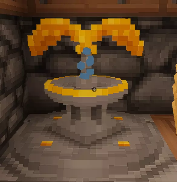 从积极方面来说,饮用自来水可以获得治疗效果,恢复少量饥饿值和法力值。从消极方面来说,我们可能会召唤出史莱姆。我建议总是把这些水龙头排空,因为史莱姆等于经验值,而经验值多多益善。也可以用武器或徒手击打水龙头,这样更有可能出现史莱姆。 喷泉示例: