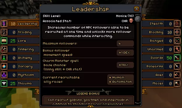 В нём можно узнать свой уровень того или иного навыка. У каждого навыка есть свой легендарный бонус, который дают за 100 уровней в этом навыке. Описание навыков: 1) Лидерство – Увеличивает количество последователей, которых можно вербовать одновременно, и разблокирует больше команд для последователей при взаимодействии. Легендарный бонус – Может вербовать гоблинов, козлов, инсектоидов. 2) Торговля – Снижает цены покупки и улучшает цены продажи при торговле у Торговцев. Легендарный бонус: Разблокирует возможность продавать предметы любого вида любому Торговцу. 3) История – Увеличивает скорость оценки предметов, и позволяет оценивать предметы с более высокой стоимостью в золоте. Легендарный бонус: +25% к скорости оценки всех предметов. У неопознанных предметов отображается стоимость в золоте. Повышается опознанием предметов. Имея низкий навык, для развития можно пытаться опознавать все предметы с пола. Чтобы развивать навык Истории в высоких значениях, нужно опознавать дорогие предметы или самоцветы. 4) Создание – Улучшает умение обращаться с ремонтным набором, увеличивая количество создаваемых предметов и устанавливаемых механизмов. Увеличивает шансы взлома замков у объектов. Легендарный бонус: Может ремонтировать большинство оружия и доспехов, используя ремонтный набор, и находить дополнительные предметы или золото при взломе сундуков. Повышается при работе отмычкой с замками, использованием ремонтного набора, а также использованием гаджетов и турелей производимые в ремонтном наборе. 5) Алхимия – Улучшает умение варить зелья с помощью алхимических наборов и увеличивает урон от брошенных боевых зелий. Легендарный бонус: Алхимические наборы никогда не портятся. Повышается употреблением новых типов зелий, которые еще не были выпиты в этом забеге, а также при варке зелий в перегонном кубе или котле. Небольшой шанс повысить при употреблении уже знакомого зелья. 6) Колдовство – Позволяет изучать заклинания Колдовства более высокого уровня из книг заклинаний. Дополнительно увеличивает бонусы силы заклинаний Колдовства от Интеллекта персонажа, когда уровень навыка выше 60. Интеллект дает вдвое больший бонус для этой школы магии. Содержит в себе преимущественно элементальные заклинания. Легендарный бонус: Заклинания Колдовства получают +40% к бонусу силы от характеристики Интеллекта и +100% к снижению времени сотворения от характеристики Ловкости. 7) Мистицизм – Позволяет изучать заклинания Мистицизма более высокого уровня из книг заклинаний. Дополнительно увеличивает бонусы силы заклинаний Мистицизма от характеристик Интеллекта + Обаяния, когда уровень навыка выше 50. Содержит в себе преимущественно мистические, призывающие и влияющие на разум заклинания. Легендарный бонус: Заклинания Мистицизма получают +40% к бонусу силы от характеристик Интеллекта, Обаяния, и +100% к снижению времени на каст от характеристики Ловкости. 8) Тауматургия – Позволяет изучать заклинания Трауматургии более высокого уровня из книг заклинаний. Дополнительно увеличивает бонусы силы заклинаний Чудотворства от характеристик Интеллекта и Телосложения, когда уровень навыка выше 60. Содержит в себе преимущественно лечащие, усиляющие, святые и изгоняющие нечисть заклинания. Легендарный бонус: Заклинания Чудотворства получают +40% к бонусу силы о