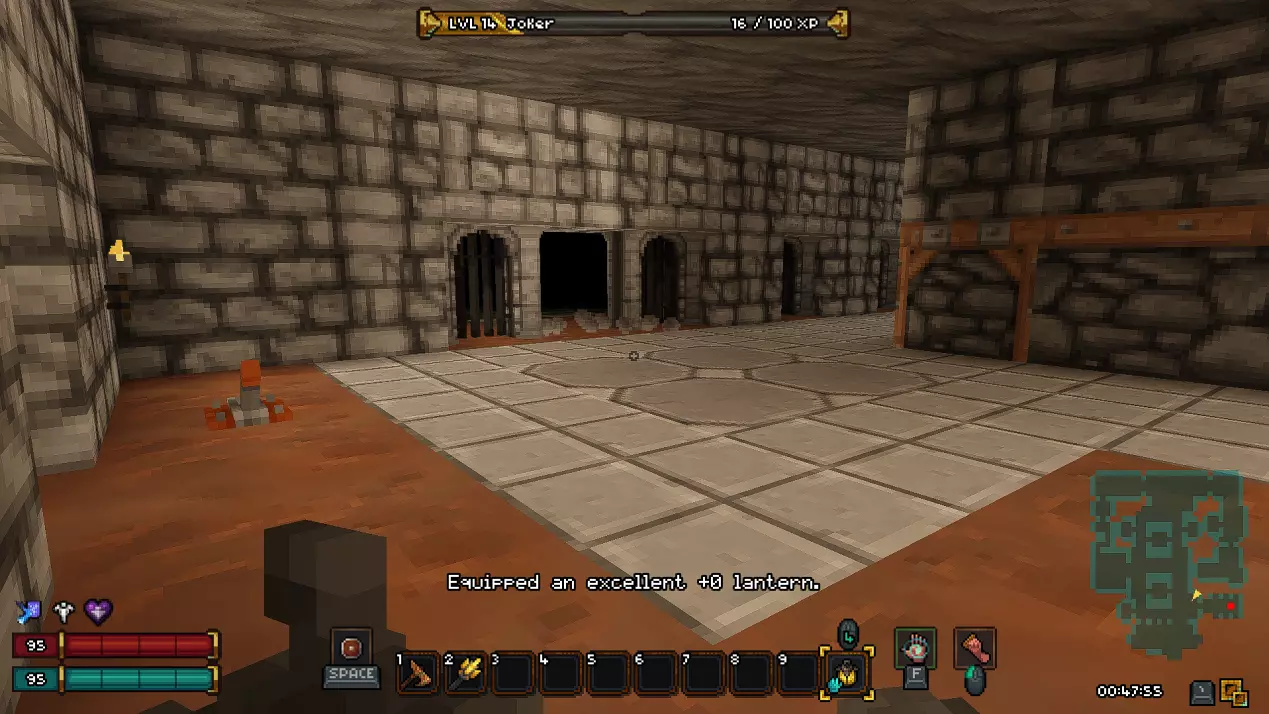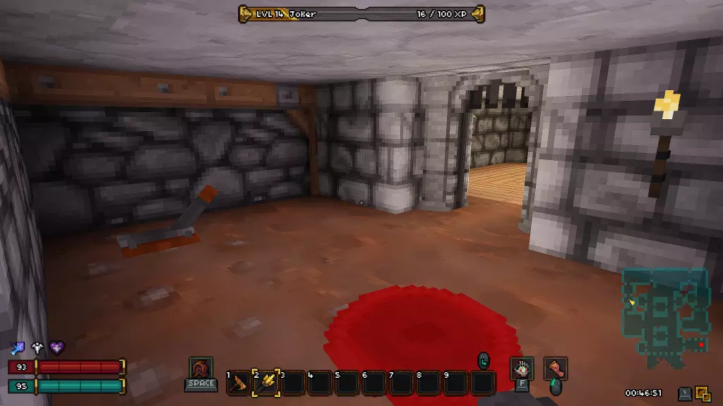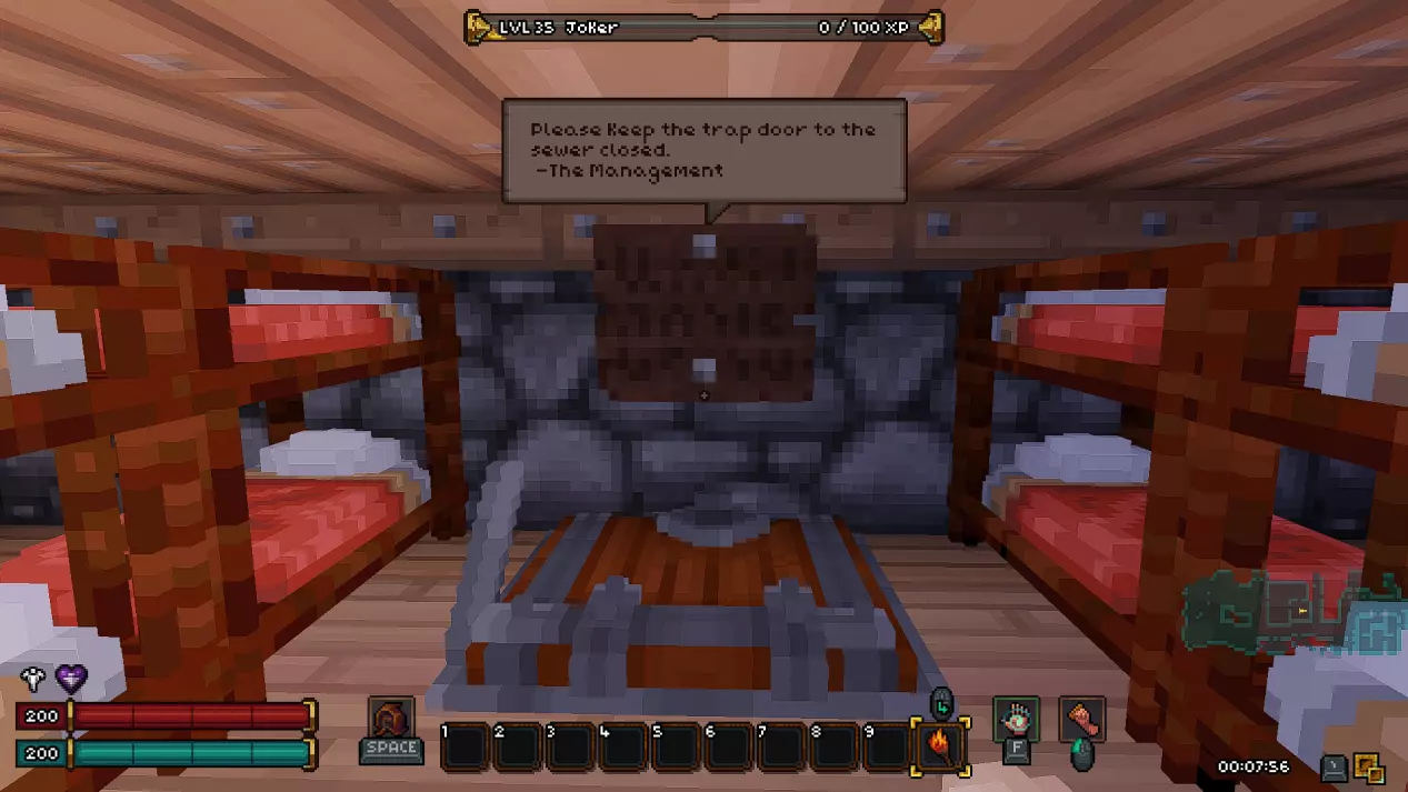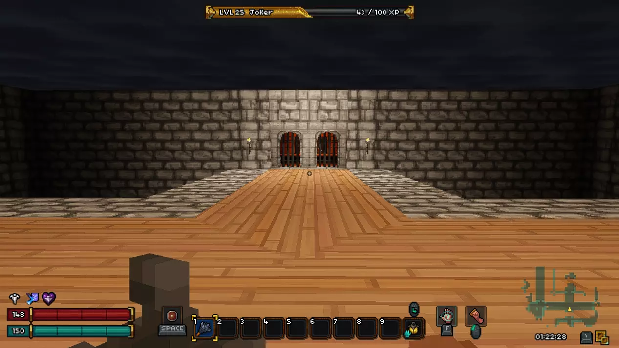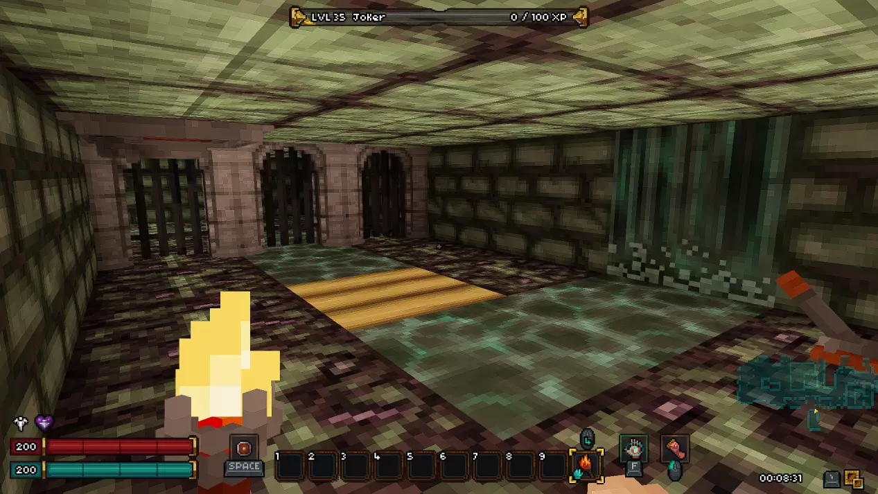 如果你担心剧透,可以直接跳过本部分,我已尽量合理组织内容,确保你不会错过任何信息。 《Barony》的第一个关卡——矿井 进入地下城后,我们会从一个起始房间开始,房间顶部有一个活板门,但角色无法通过它向上攀爬,此外房间里还有几根火把。