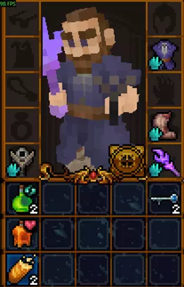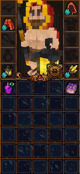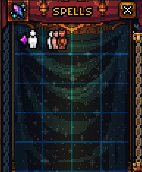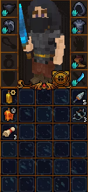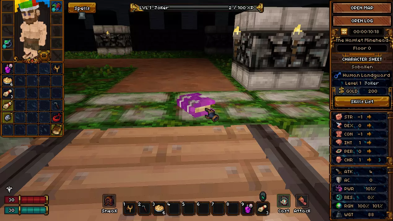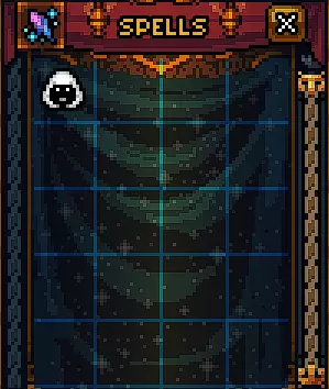 初始没有法术。 有用的物品包括:防毒护符、两瓶速度药水、优秀的远程武器(+11伤害的弓和会自动返回的回旋镖)、带有【心灵感应】技能的眼罩(可以看穿墙壁看到敌人)。 【心灵感应】技能演示 未使用技能时的墙壁: