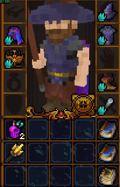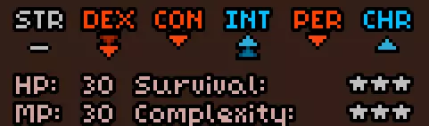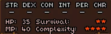 初始没有法术。 有用的物品包括:单筒望远镜(宝石识别速度提升200%,识别+1)、【解除诅咒】卷轴(可解除任意物品的诅咒,一次性)、鹤嘴锄(可破坏结构)。 单筒望远镜能让你伪装成商人同伴,即使身为怪物也能与他们交易。然而,如果你处于【通缉】状态,单筒望远镜将无法发挥作用。此外,不知为何,你不能处于隐身效果下(单筒望远镜必须让商人看到,否则他会发起攻击)。 开始竞赛后,你将获得20点领导力、50点贸易、50点历史、10点物品制作、10点炼金术以及25点斧头技能点。 8)魔法师 初始属性: