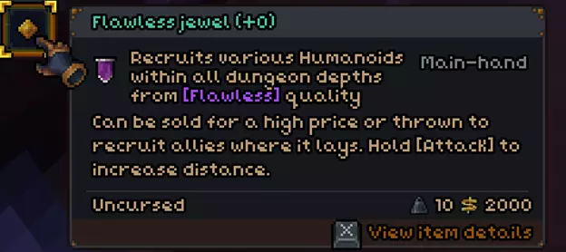 拥有较高抗性: 长矛和剑。 拥有较低抗性: 魔法和远程攻击。 人类和巨魔对矮人友好。 拥有一个初始法术: 宝石创造——你可以升级你的宝石(自行生成的宝石),用于招募盟友(将宝石扔向类人生物,具体在哪个楼层以及可以招募谁,均在描述中有说明),或者将其出售。宝石可以升级,升级后宝石会变得更贵,但允许在任意楼层招募类人生物。价格为2000的宝石是最高级的,无法再进一步升级。 完全升级后的宝石示例: