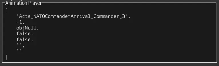 在初始框下方有一个你不熟悉的框,它用于控制动画。 [ "Acts_NATOCommanderArrival_Commander_3", -1, objNull, false, false, "", "" ] 这个框里显示着一些奇怪的乱码,但它们都有特定含义。不过我们先不管其他内容,只看其中的“-1”,它代表动画的时间。-1的意思是“不要让动画停止”。如果你想让动画在特定时间(比如3秒)停止,只需将-1替换为3即可。 注意:在动画查看器中,左下角会显示计时器。 我的修改结果如下: [ "Acts_NATOCommanderArrival_Commander_3", 4.7, objNull, false, false, "", "" ] 注意:如果在编辑此部分时遇到错误,通过Ctrl+E重新应用动画会重置该部分,这可能会解决问题。