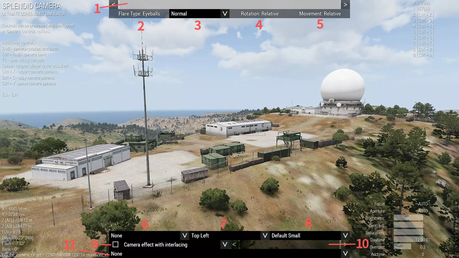 滑块:相机移动速度调节 最右侧为100%(默认)速度,最左侧为0%速度。 需要减慢相机移动时非常实用。 按钮:更改光晕类型 提供眼球模式和相机镜头模式。 当太阳位于相机视角内时生效。 下拉菜单:更改视觉模式 提供正常、夜视以及红外颜色0~64。 按钮:更改旋转轴 绝对代表全局轴,相对代表本地(相机)轴。 强烈建议切换为相对模式。当相机倾斜时非常实用! 按钮:更改移动轴 与上述类似,但针对移动轴。 在相对模式下,按W键将使相机向相机前方移动,而非相机朝向的方向。下拉菜单:标志应用器 选择列表中的项目,该项目将显示在镜头中。 可使用所有DLC、更新和MOD的标志。 下拉菜单:标志定位器 可将标志位置更改为上、中、下以及左、中、右。 下拉菜单:标志效果选择器 可选择大小和黑白效果。 下拉菜单:滤镜效果选择器 提供预设项目,如暗角效果、灰尘效果和电影边框。 可同时启用多个滤镜。 滑块:滤镜强度 最左侧为0%,最右侧为100%强度。 可对所有滤镜进行设置。 下拉菜单:构图参考线 可在镜头视角中显示中心构图、三分法则等参考线。 隐藏界面时,参考线也会隐藏。注意:如果点击某些界面后无法移动相机,调整右下角的官方滑块可能会解决此问题。此外,艺术支持者版本中引入的【Splendid Camera】功能可让你更高效地截图。 在 Eden 编辑器中打开 Splendid Camera 时,按 Ctrl+C 保存相机视角。红色线条用于显示视角。 在预览中,在调试控制台输入 call PLP_fnc_loadCamera 可加载视角。在 Eden 编辑器中,按 Ctrl+P 加载视角。按住 Shift 键可加快相机倾斜速度。 控制方式:按住 Ctrl+鼠标右键拖动可倾斜相机。按住 Ctrl+Shift+鼠标右键拖动可以 10 倍速度倾斜相机。 动画播放器:动画播放器允许你在 Eden 编辑器和预览中进行预览。