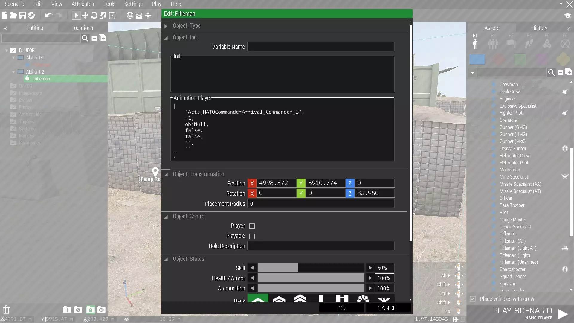 我已将动画“Acts_NATOCommanderArrival_Commander_3”应用到AI单位上。应用了动画的单位也可以通过常规的【 eden编辑器】控制方法轻松操作。但我想使用“指向”动画的最后部分,所以需要在所需时间停止动画。要执行此操作,请打开单位的属性。