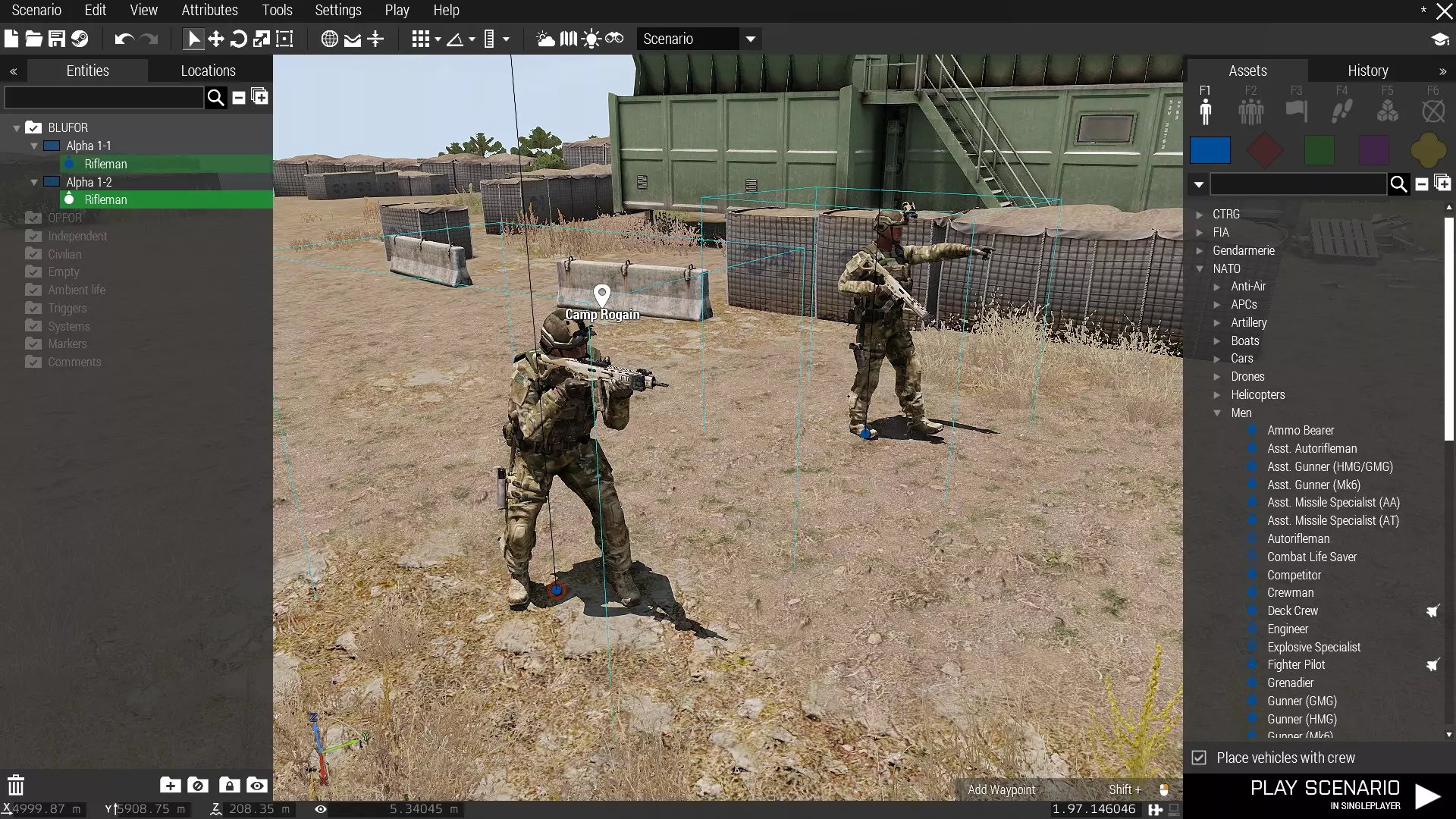 此图片展示了通过搜索词可找到的部分动画。 注意:搜索框接受工具提示中显示的部分命令。最重要的是使用【/】(斜杠)来分隔命令。 例如,输入【acts_/nato】将筛选出动画名称中同时包含【acts_】和【nato】的结果。如果找到满意的动画,你可以复制其名称,然后关闭动画查看器。 操作控制:点击列表中的名称后,按【Ctrl+C】即可复制所选名称。出现白色闪烁即表示操作成功。按【Esc】键可关闭查看器。 返回至 Eden Editor 界面。将鼠标放在你的 AI 单位上,应用刚才复制的动画。 操作控制:按【Ctrl+E】可将动画应用到鼠标悬停的单位上。注意:不建议对玩家应用动画。这会导致预览中出现一些意外动画。