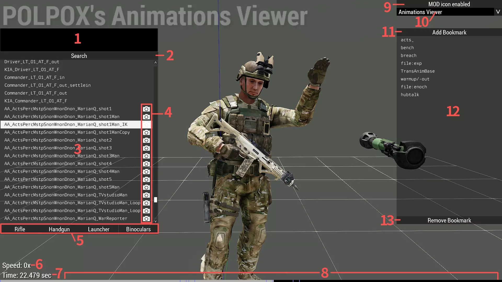 编辑框:搜索框 输入任意文字可筛选列表。 部分特殊命令可用: file:<任意文字> 按文件路径筛选。 disableWeapons:<0或1> 0表示可射击,1表示不可射击。 若希望角色在动画过程中射击武器,别忘了检查该参数。 IK:<0、1、2或4> 武器IK(反向运动学)是用于将角色手部与武器匹配的技术。 0代表无(已禁用),1代表步枪,2代表手枪,4代表发射器。 若武器无相关配置,则此命令无效。 pistol:<0或1> pistol:1用于筛选右手持有手枪的动画。 binocular:<0或1> binocular:1用于筛选左手持有 binocular 的动画。按钮:搜索按钮 列表:动画列表 图标:MOD图标 若此处显示图标,则表示该动画已添加MOD和/或受MOD影响。 按钮:显示/隐藏项目 点击以切换项目。 文本:动画速度 控制方式:可通过按下【时间加速】和【时间减速】键来加快或减慢动画速度。默认按键为“-”和“=”(0键右侧,退格键左侧)。 文本:动画时长 部分动画可能不生效。 进度条:动画时长 左侧为开始,右侧为动画结束。 此进度条上的红线和蓝线分别代表右手和左手IK状态变化。 部分动画可能同样不生效。 按钮:显示/隐藏MOD图标 显示MOD图标可使动画识别更便捷,隐藏MOD图标可提升性能。请根据需求选择。下拉菜单:查看器模式 有3种模式可供选择:动画、手势和表情查看器。 手势是指“动画中的动画”。表情是指面部表情。 使用动画查看器以外的模式时,部分功能可能无法正常工作。 手势和表情的使用方法与动画相同。 操作方法:复制手势或表情的名称后,在角色身上按Ctrl+E即可应用该手势/表情。但应用手势或表情前必须先应用一个动画。 按钮:添加书签 如提示所示,点击此按钮可保存当前搜索词。 列表:书签 双击项目将应用书签中的搜索词并执行搜索操作。按钮:移除书签 在选中书签列表中的项目时,双击即可移除该书签。此外,还可以调用一些实用功能(主要供开发者使用)。 按下F1键,可以显示简单的配置查看器。 此功能在角色单位的动画查看器外无法使用。 按下F2键,可以显示IK查看器。 它会显示左右手IK的状态。 并且,动画列表中存在一些官方动画的“别名”。 PLP_[...]_Hgun:右手持有 handgun。 PLP_[...]_enableFire:此动画与原版不同,可以进行武器射击。 PLP_[...]_Hgun_enableFire:同时具备上述两种效果。 [...]_IK:应用了武器IK,因此所有武器都能适配此动画。 Splendid Camera 还记得有许多修改过的界面吗?让我们来谈谈它们的每一个部分。