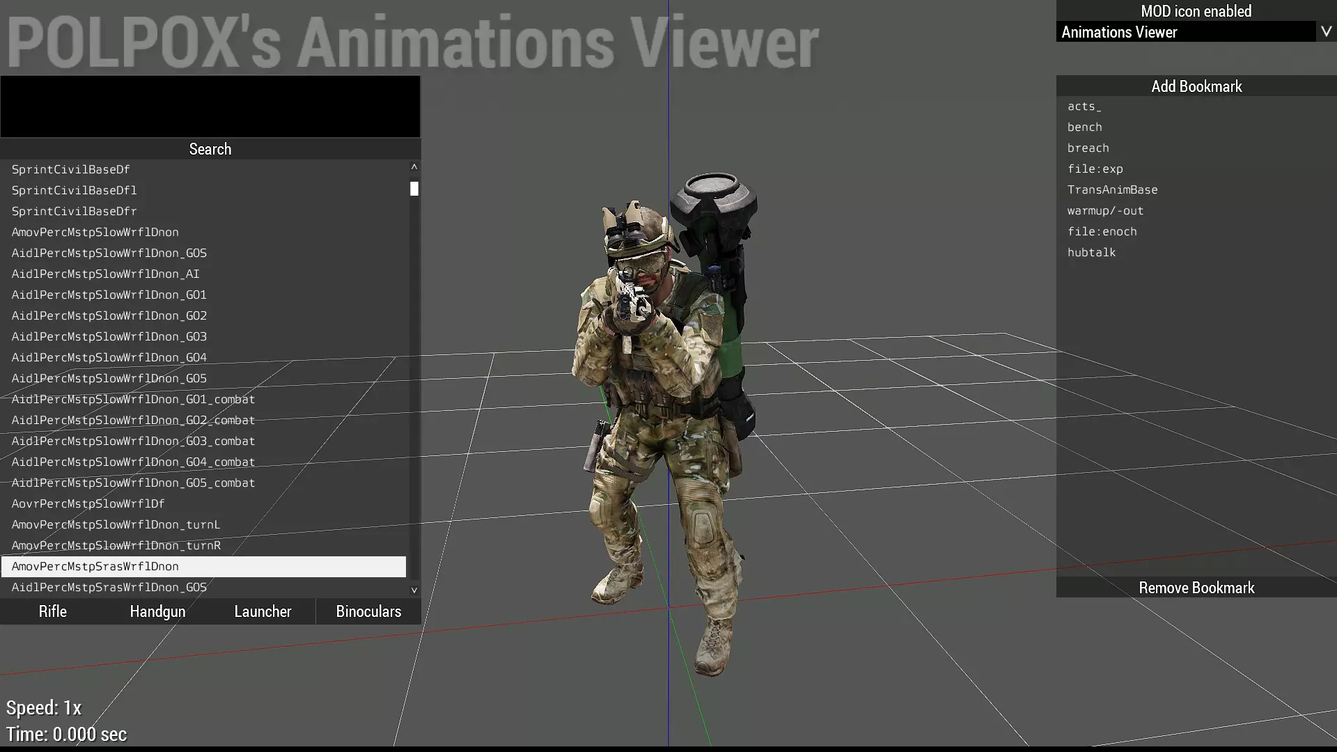 这是由Artwork Supporter推出的动画查看器。它非常实用,能查看《武装突袭3》中加载的所有动画,包括模组添加的动画。 注意:请注意剧透。过场动画中使用的动画也可以被访问和查看。 操作方法:在动画查看器中,右键拖动可旋转视角,左键拖动可移动视角,鼠标滚轮上下滚动可缩放镜头。 你可以看到左上角的方框,那是搜索框,你可以输入任意文字来筛选动画。比如输入“acts_”。 操作方法:当你聚焦(最后点击)搜索框时,按回车键是搜索动画的快捷键。