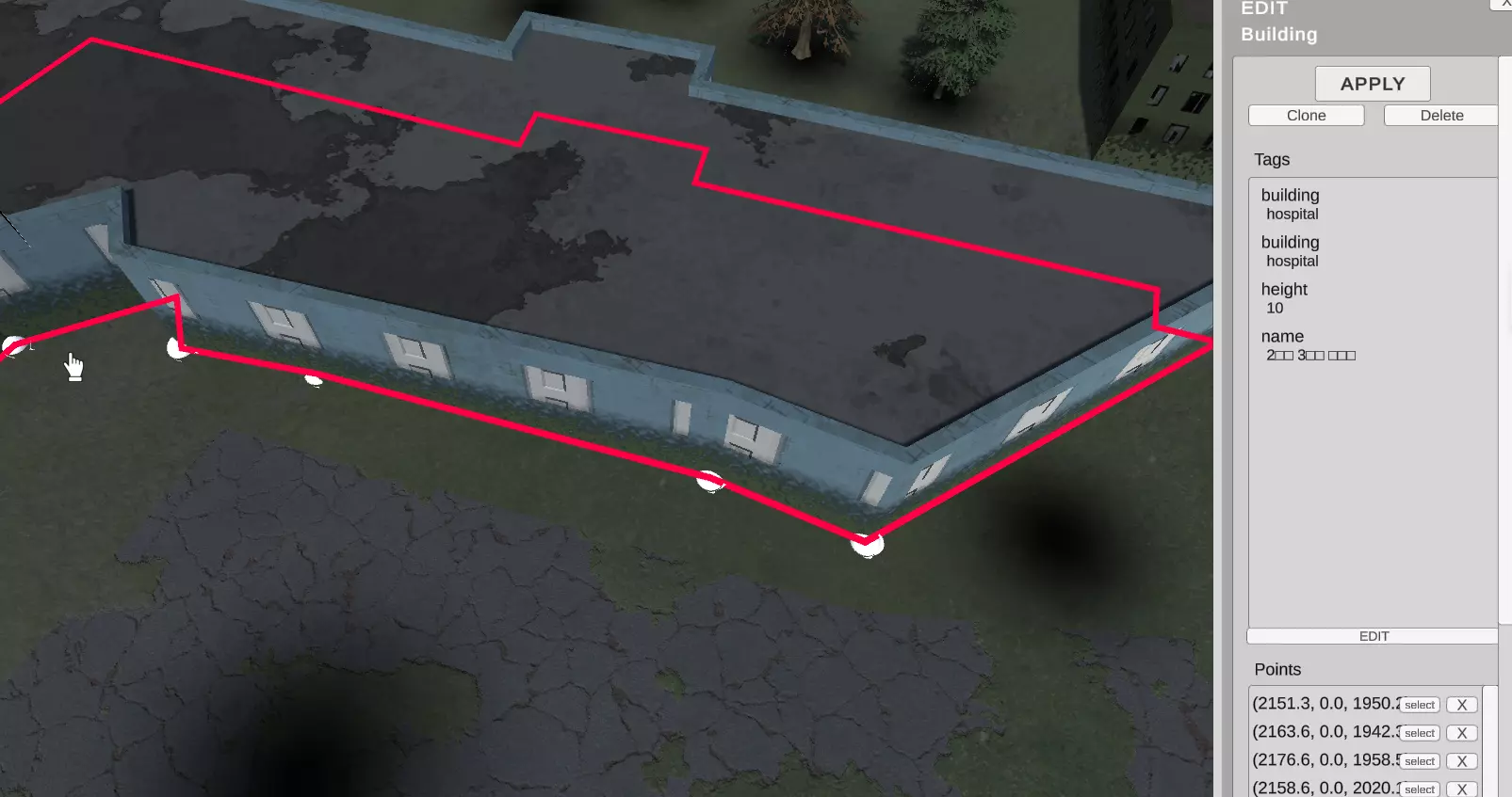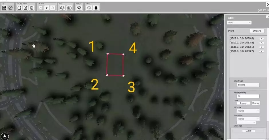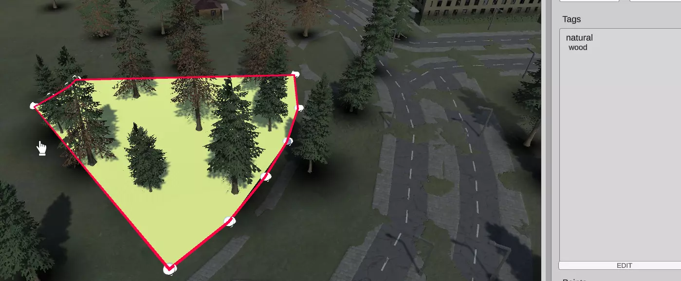 树(OSM标签:“nature”,值:“tree”):将单个树添加到选定位置 点物体:所有其他单个物体(目前可用的有:“广告牌”、“天线”、“长椅”、“垃圾桶”、“废墟”) POI数据:选定位置的用途(不仅仅是建筑物)。您可以使用其中一个可用位置,如:“停车场”、“警察”、“监狱”、“医院”、“药房”等。这些选项会创建与OSM系统相关的标签。 增加一块土地 要定义区域的用途,您需要使用此选项。请注意,这不会创建任何物理实体。是用于在游戏中物体生成或其他功能的信息。