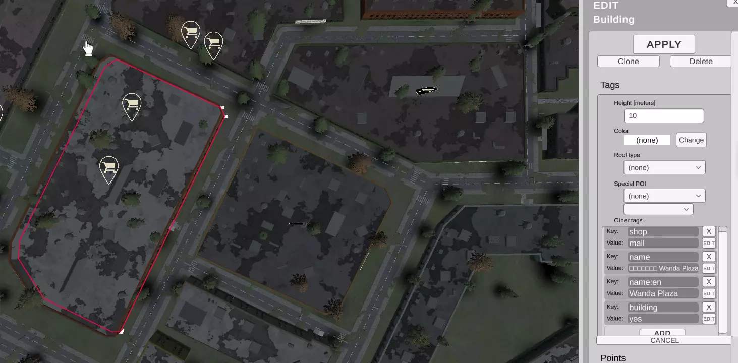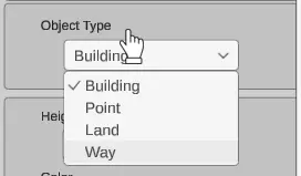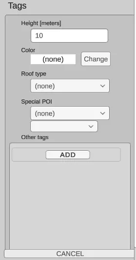 高度(Osm标签:“高度”):定义建筑物的高度 颜色(Osm标签:“建筑:颜色”):建筑的颜色(请注意,在编辑的建筑中不会看到颜色变化,在重新加载地图后,颜色将可见) 屋顶类型(Osm标签:“屋顶:形状”):屋顶的类型(可用值为:“平顶”、“金字塔形”、“山墙”、“圆顶”、“嬉皮士”、“半嬉皮士”、“洋葱”、“圆形”、“盐盒”、“复斜式屋顶”、“棚屋”、“复折式屋顶”) 特殊POI(关键字:“IFZ”):建筑物的功能(如“医院”、“警察局”等)