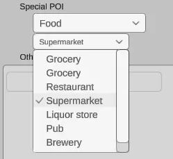此字段定义建筑在游戏中的角色。第一个选择框定义大类别,第二个定义小类别。(图示大类别为食品,小类别为超市,你也可以选择杂货店或餐厅)标签的字段和数值未连接到OSM系统,它们是为无感染区自定义使用的。(这部分内容不会影响原地图网站,但具体的地图编辑代码尚不明确,若有专业人士可进行检查,以避免因漏洞导致改动被上传而引发问题。)