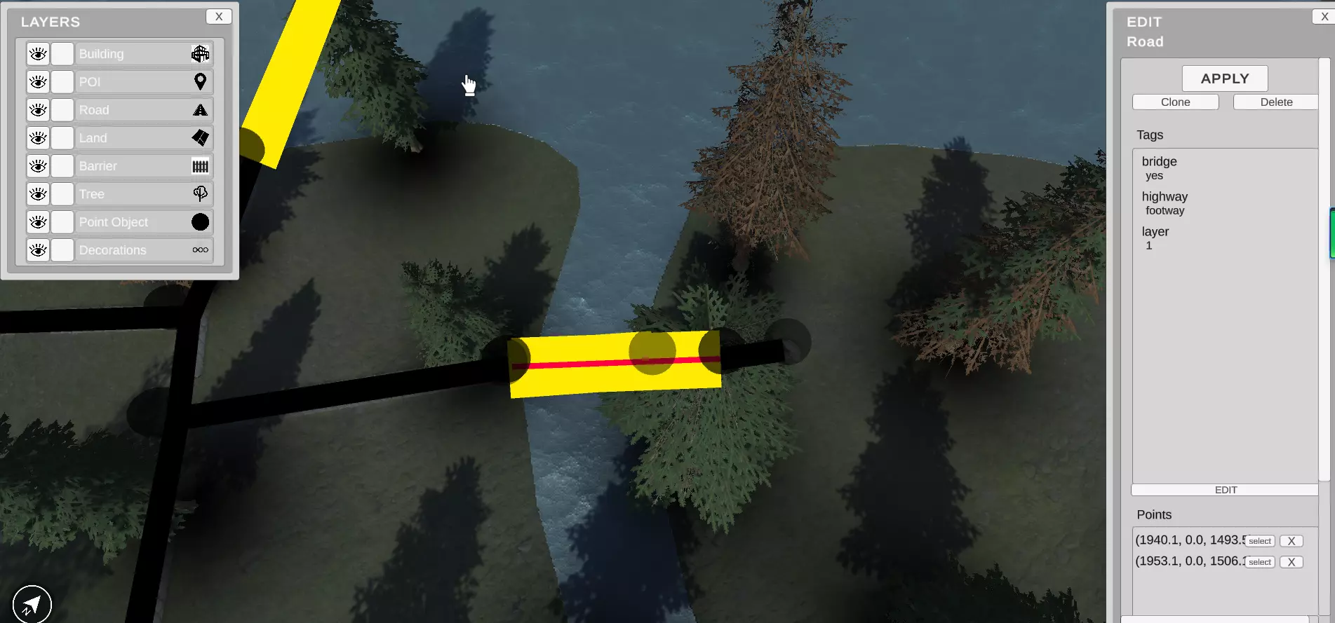 可供选择的土地用途类型列表: 【公园】(OSM标签:“leisure”,值:“park”) 【树林】(OSM标签:“natural”,值:“wood”) 【水域】(OSM标签:“natural”,值:“water”) 【停车场】(OSM标签:“parking”,值:“surface”) 【铁路】(OSM标签:“landuse”,值:“railway”) 【草地】(OSM标签:“landuse”,值:“grass”) 【居民区】(OSM标签:“landuse”,值:“residential”)"residential"(OSM标签:“土地用途”,值:“住宅”) "Industrial"(OSM标签:“土地用途”,值:“工业”) "Construction"(OSM标签:“土地用途”,值:“建筑”) "Pitch"(OSM标签:“休闲”,值:“球场”) 添加道路 也可以添加由一列点声明的地图对象。目前,地图编辑器有两种“道路”类型: 障碍物——用于分割空间的物理对象。目前可以声明【障碍物】的类型,如:【围栏】、【门】、【墙】、【树篱】、【路缘石】、【护柱】、【升降门】。 【道路】——道路对象,游戏中使用的路径。您可以声明道路类型:【人行道】、【小路】、【自行车道】、【初级】、【次级】、【三级】、【住宅】、【服务】。每种类型的道路都可以设置为【桥梁】。要查看道路对象,需要在视角启用道路图层。 示例——如何添加一座桥: