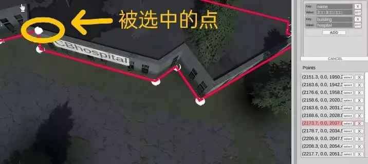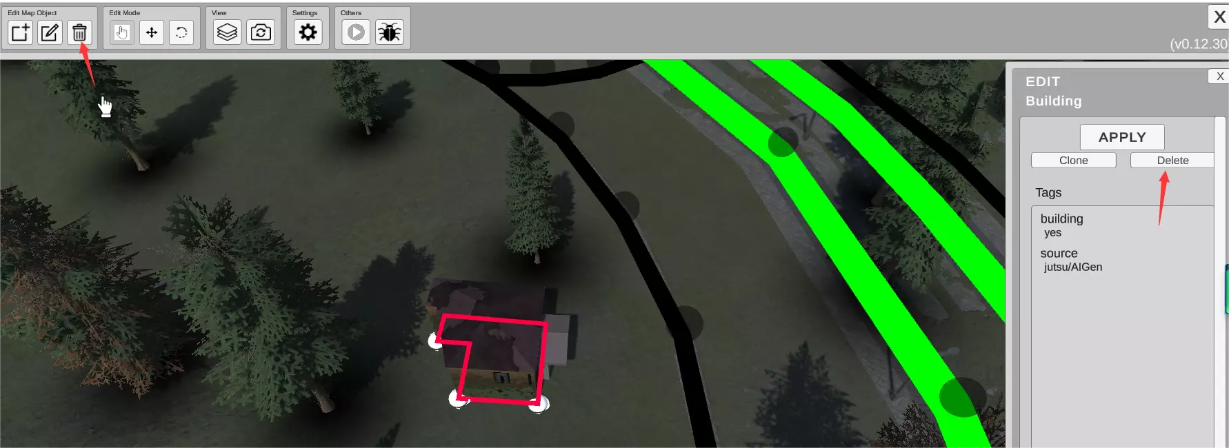 删除两个点后的楼,不知为何似乎会导致原有贴图失效,所以如果你能接受一些奇形怪状的楼也可以不改。 使用【Edit Mode编辑模式】选项进行编辑。 编辑模式选项允许您通过鼠标交互(移动、旋转)修改地图对象,也可以修改选定地图对象的点。 目前有3个选项可用,从左到右依次为: 1. 选择-在此模式下,只能选择对象(如果单击SHIFT+下一个对象,则可以选择多个对象) 2. 移动-允许移动选定对象(在此模式下也可以选择对象) 3. 旋转-允许旋转选定对象(也允许选择对象)移除地图对象 要删除地图对象,您需要选择一个对象,然后单击【编辑】面板内的【删除】按钮,或使用主面板中的【删除(Delete)】按钮。您也可以使用键盘上的【删除】按钮。