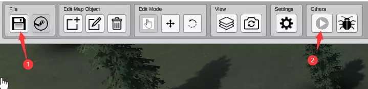 5.保存地图 要保存您的修改,请使用【保存】按钮(1)或键盘组合键【Ctrl+S】。保存后,您可以通过【在游戏中体验】按钮(2)在游戏中测试编辑过的地图。此时您所做的改动应该就能在游戏里可见(仅限于从地图编辑器启动游戏,直接启动游戏无法看到改动)。
