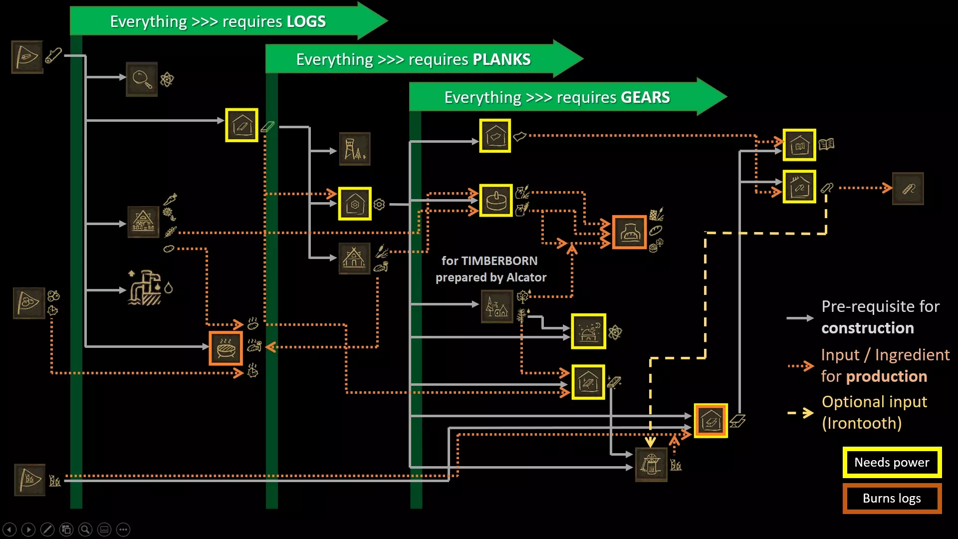 一张展示生产设施在投入、产出和所需建筑材料方面如何相互关联的图片。科技树