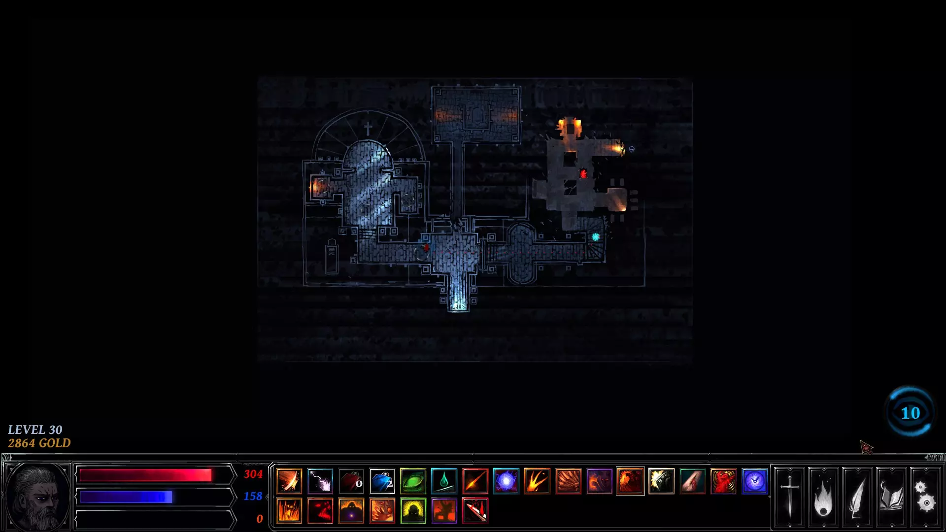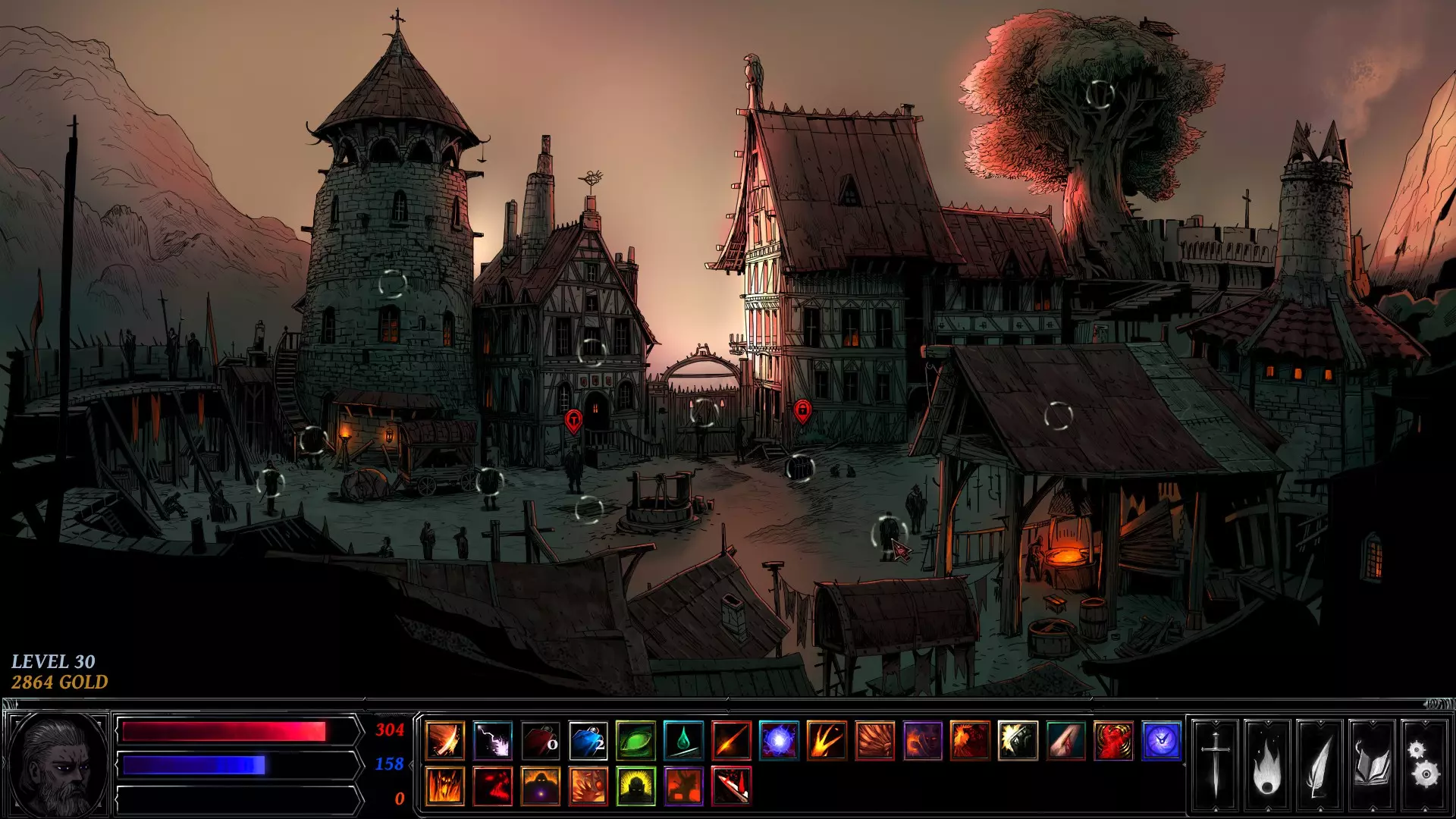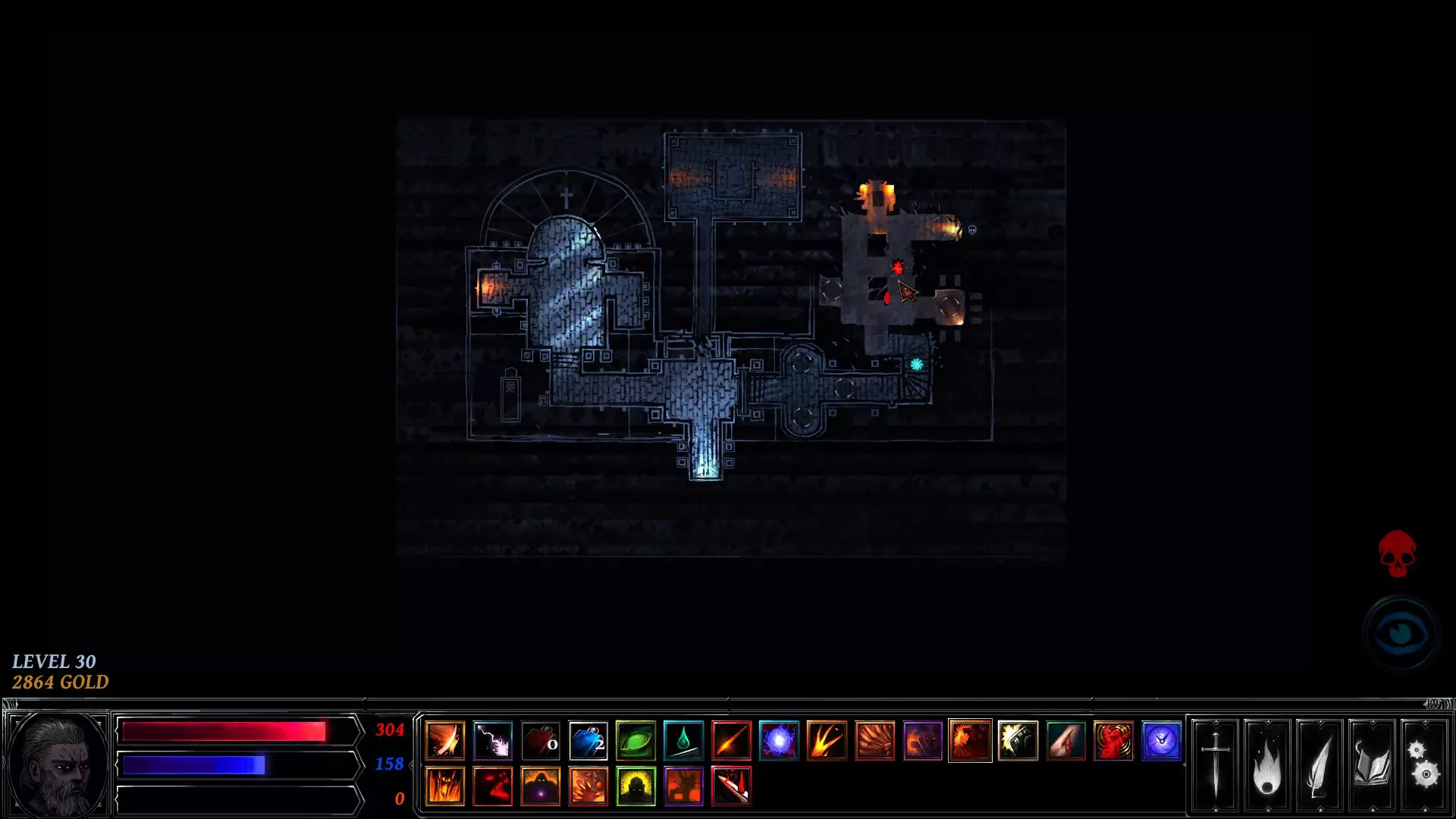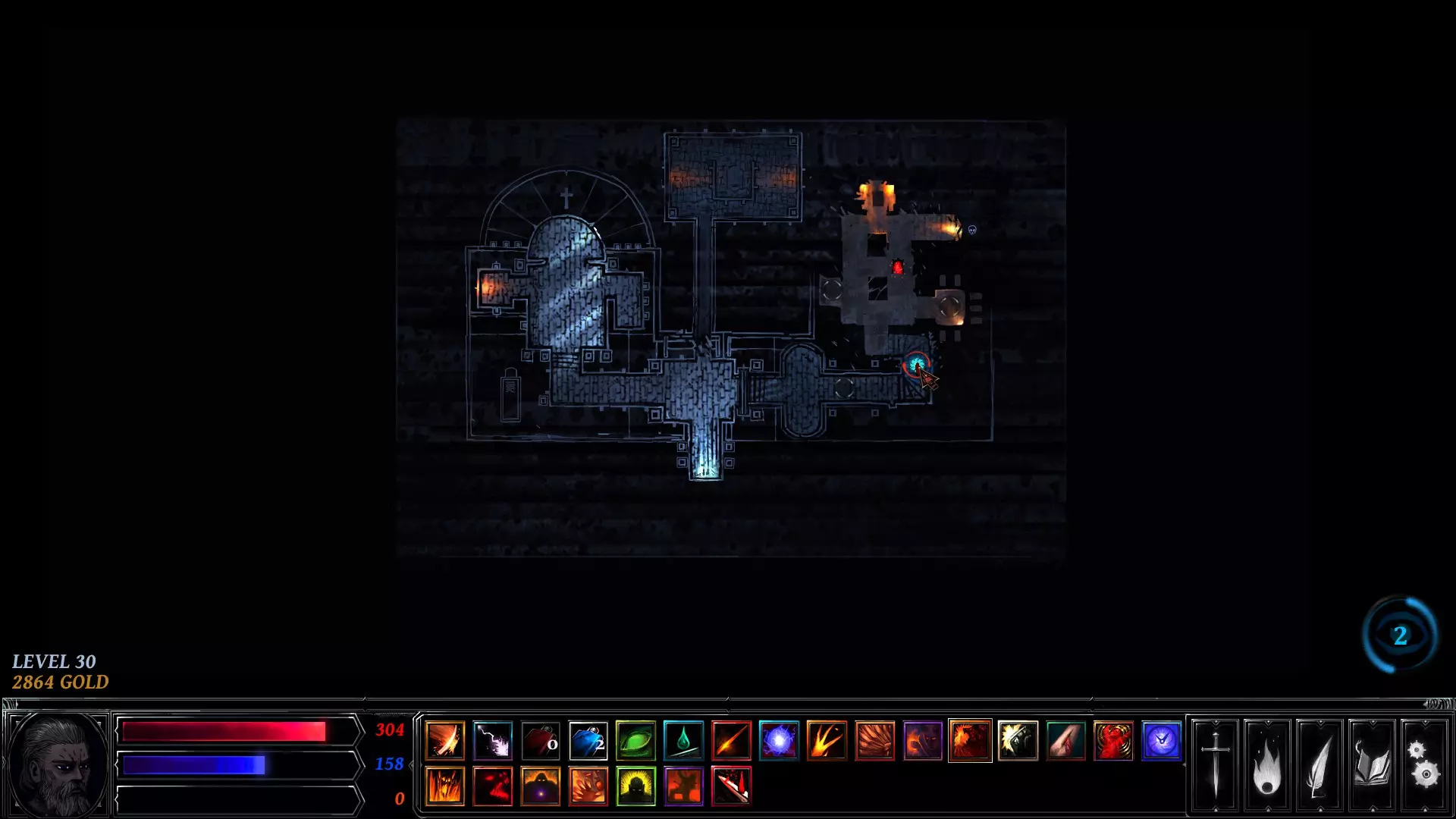 你在左右两侧看到的白色圆圈是可交互物体。这些标记着地牢中可以触发事件的地点——例如剧情任务、宝藏、陷阱、恶魔祭坛或敌人。战利品