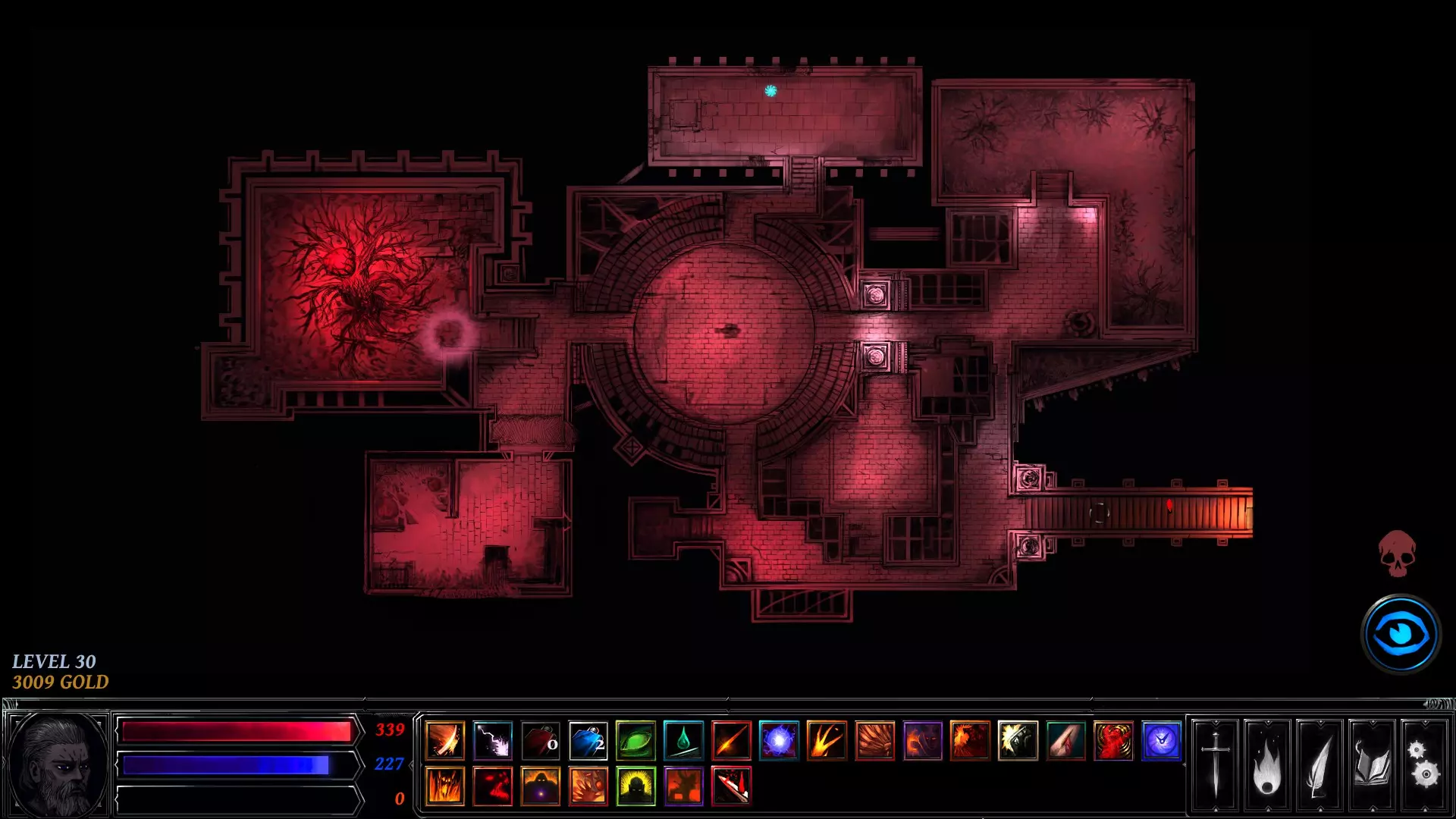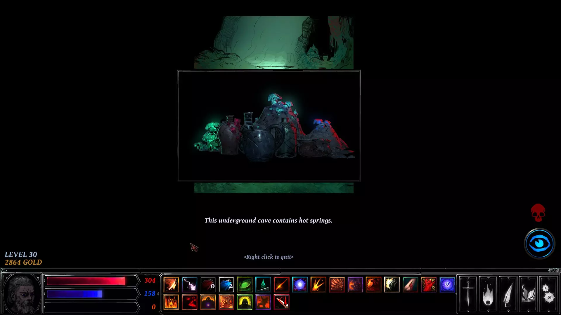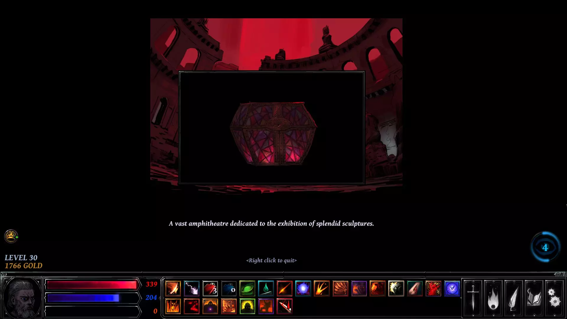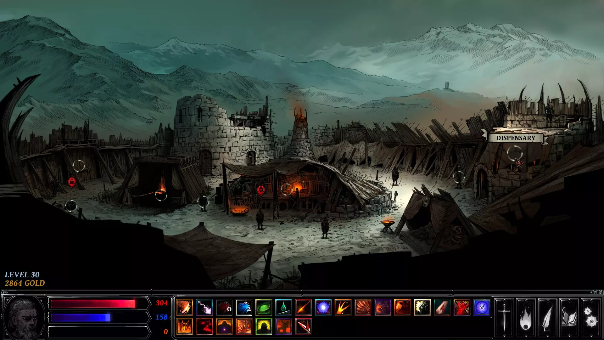 你在左右两侧看到的白色圆圈是可交互物体。这些标记着地牢中可以触发事件的地点——例如剧情任务、宝藏、陷阱、恶魔祭坛或敌人。战利品