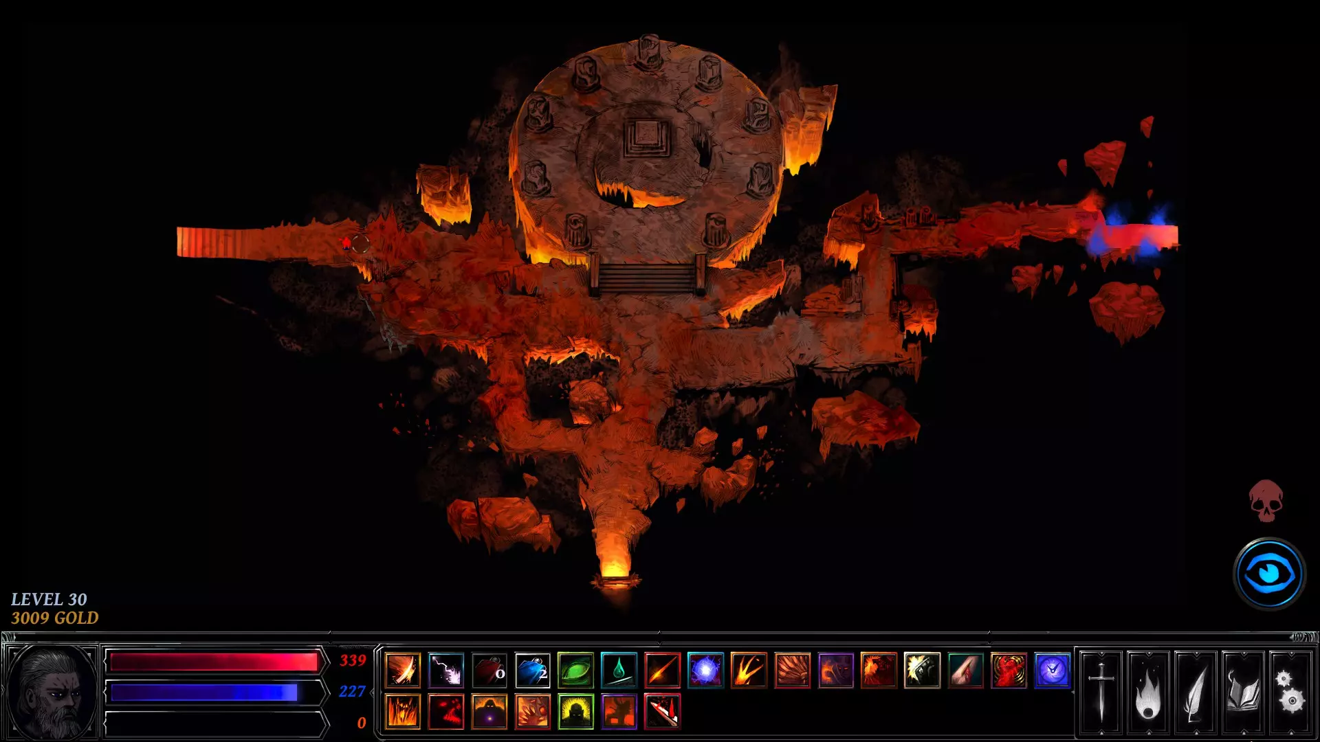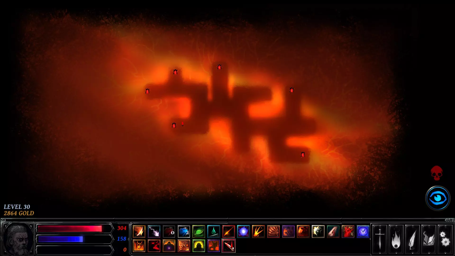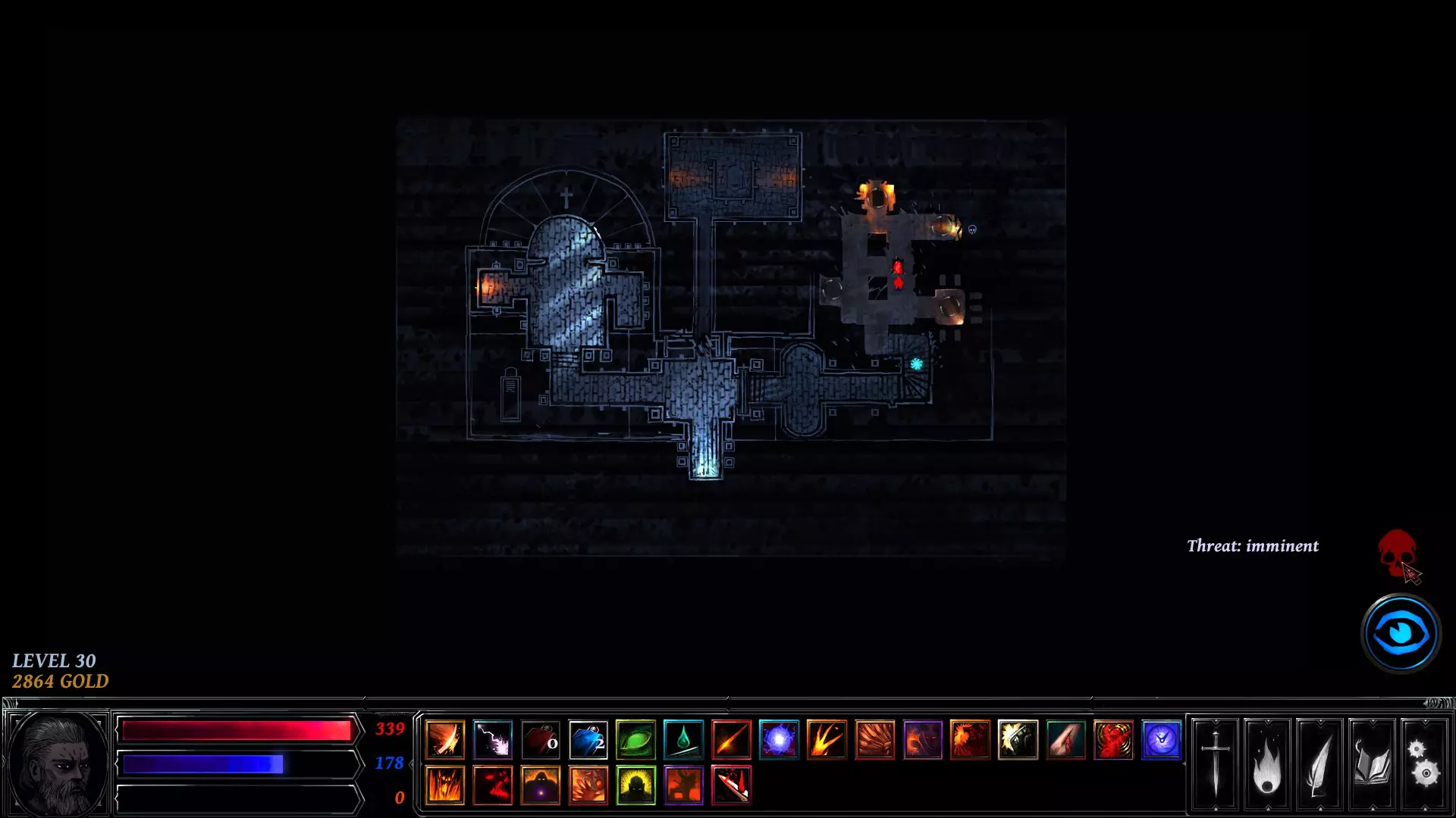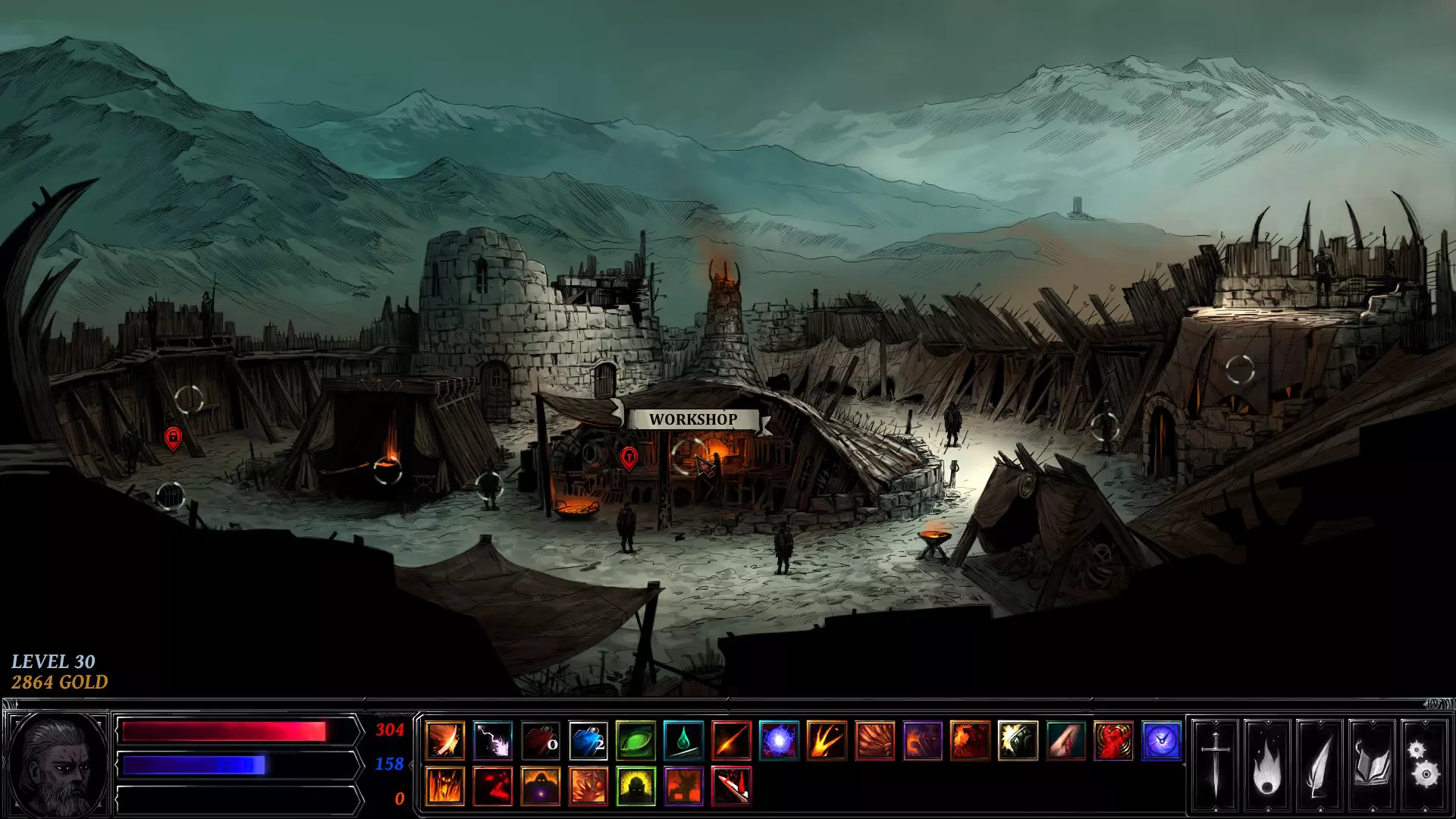 你在左右两侧看到的白色圆圈是可交互物体。这些标记着地牢中可以触发事件的地点——例如剧情任务、宝藏、陷阱、恶魔祭坛或敌人。战利品