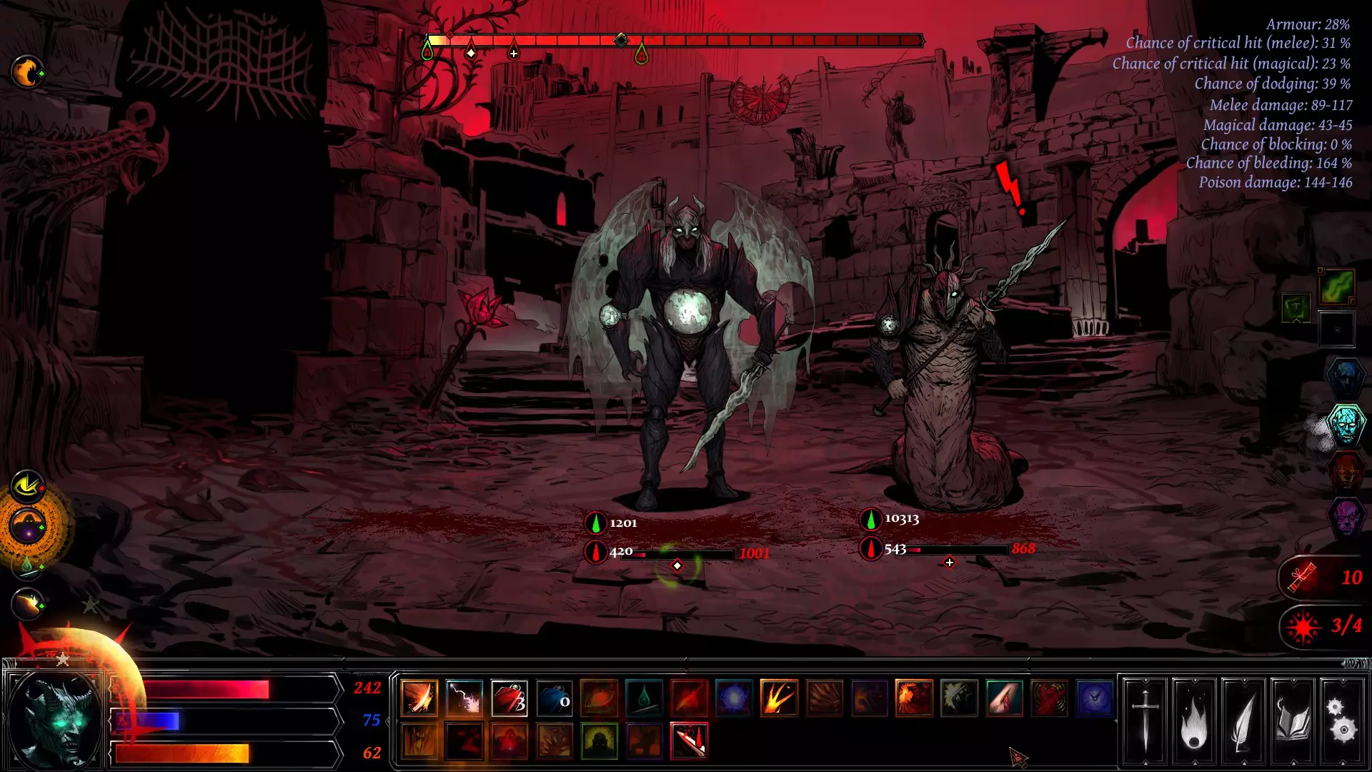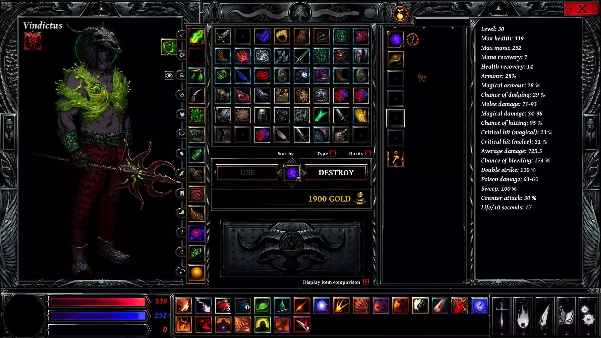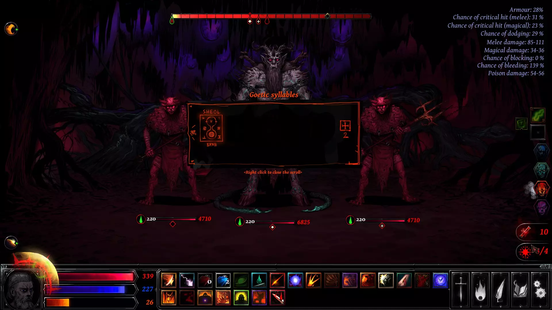 These are the passive skills in order for better synergy with active skills: Baal's Fluid – Increases basic Poison damage (1 point per level) Spreading the Plague – When an enemy takes Poison damage, 20% of it is applied to all other enemies Toxic Sting – When hit by melee damage, reflect 20% Poison damage back to the attacker Anatomic Vision – +25% Bleeding chance. Melee attacks may apply Bleeding equal to 40% of the damage dealt. Every 10 seconds, targets lose 1 HP per Bleeding point, which is then reduced by 80% Poisonous Explosion – When you land a Critical Hit, deal +15% poison damage to all enemies Wounds Suction – When an enemy takes Bleeding damage, recover 20% of the damage as Health Gaping Wound – Adds Bleeding points to the target equal to 20% of the Critical damage dealt Porosity – When an enemy heals, gain 30% of that amount and split it between Health and Mana Natural Regeneration – Recover 5% of your max Health every 10 seconds Drakul’s Smile – Melee attacks heal you for 5% of the damage dealt Asmodeus’ Curse – Gain 5% of the damage dealt (physical or magical) as Health Spouse of Shadows – +5% Dodge chance Assassin – Start fights 4 seconds ahead. Your first hit is always a Critical Zealot Fever – Recover Mana and Rage when melee attacks hit. (1 base point + 0.1 per level) Relentlessness – After a melee attack, immediately strike again for -50% Hot Blood – Start combat with +10% Rage Supernatural Reflexes – 30% chance to counter melee hits for -50% damage Amplitude – 30% chance to hit adjacent targets at -50% damage King of the Hill – +5% Melee Critical chance Fireblow – Melee attacks deal unavoidable +20% weapon damage Devastating Impact – Additional unavoidable +20% weapon damage Mad Dog – Start with +20% Melee damage (decays by 1% per sec, +20% bonus when you turn into a demon Step-by-Step Skill Rotation for Max DPS These are the active Skills (Max level) in the recommended order of use during battle for maximum effectiveness (Most effective if Baal's form/demon form is charged) You need to proc the Double Strike stat for this to gain more Rage in a short time (Relentlessness, Hot blood, Fireblow and Devastating Impact passives increase your chances hit more and generate Rage after hit) Start the skill with:Focus Beelzebub’s Fury Time Warp to delay their move Asmodeus' Outburst to reduce fatigue by 60% Beelzebub’s Claw Note: You need to stop once you notice the poison is about to trigger (don’t let it reach 1 second before the poison and bleeding proc) — this prevents wasting the effect. Keep your Rage above 40 and avoid using Rage-draining skills If your Rage is still below 40 with Baal's Form: (Usually occurs if your level is not yet max) Use Sacrifice to Moloch, then Interruption. This combo should push your Rage past 40 If Rage is 40 or above with Baal's FormContinue with: Satanic Power Venom of Limbo Sacrifice to Moloch Apocalyptic Choreography Wound Aggravation Baal’s Form After transforming, you should have more than 40 Rage again Proceed with: Satanic Power Sacrifice to Moloch Apocalyptic Choreography Balam's Frenzy Sacrifice to Moloch Interruption (If you didn't used it earlier) Sacrifice to Moloch Destruction Sacrifice to Moloch Balam's Strike Wound Aggravation to double the stacks again Infection on each enemy Sacrifice to Moloch Balam’s Strike to gain fatigue and trigger the stacked poison and bleeding points If some enemies died, you can recast Interruption and Destruction but don't forget to use it this way: Sacrifice to Moloch Interruption Sacrifice to Moloch Destruction Tip: Always use Balam's Strike if you don't have other skills available to attack If Rage is 40 or above without Baal's FormIf you don't have Baal's Form charged yet, proceed with: Sacrifice to Moloch Interruption (Attack the earliest enemy to attack in the Turn Timeline) Sacrifice to Moloch Destruction Balam's Frenzy If Rage is 80 or above after Interruption and Destruction Satanic Power Venom of Limbo Sacrifice to Moloch Apocalyptic Choreography Sacrifice to Moloch Balam’s Strike Wound Aggravation Infection to each enemy Sacrifice to Moloch Balam’s Strike to trigger the stacked poison If some enemies died, you can recast Interruption and Destruction but don't forget to use it this way: Sacrifice to Moloch Interruption Sacrifice to Moloch Destruction Tip: Always use Balam's Strike if you don't have other skills available to attack Congratulations — you did great damage! Use Atonement to heal. You can cast it after Sacrifice of Moloch to gain health Use Martyr's Death Rattle if the enemies are not yet defeated, and your health is very low (Usually happens on bosses) Use Decay if an enemy's turn will be available right after your melee hit — it adds extra Fatigue to delay their turn You can cast Time Warp again when health is low to delay their move Recipes and Crafting 1 - 7 To craft powerful equipment in Hellslave, you’ll need a mix of specific items and materials — but first, you’ll need to find the recipes that unlock them Where to Find Recipes? Recipes are found inside dungeons (You will see a floating scroll inside the dungeon) Below is a list of items and materials needed for early crafting recipes. If you come across anything on this list, DON’T SELL IT — you’ll need it later to craft powerful gear Weapons • Short Sword • Lich Trophy • Bestial Axe • Short Dual-Blade Sword • Virtuoso Blade • Troglodyte Golden Axe • Abbatardes Guard Sword Materials • Silver Funeral Mask • Iron Ore • Owl Bone • Infernium Ore • Demon Tooth • Abyss Coral • Cobra Venom • Pigments From High-Kolkhaz • Stones of Arbenia If you're playing on Normal, crafting Recipes 1–7 is pretty straightforward. All the required items and recipes are easy to find or purchase during your first run You're wondering where Recipes 8–16 are, right? These become available after you complete your first run. Once you f