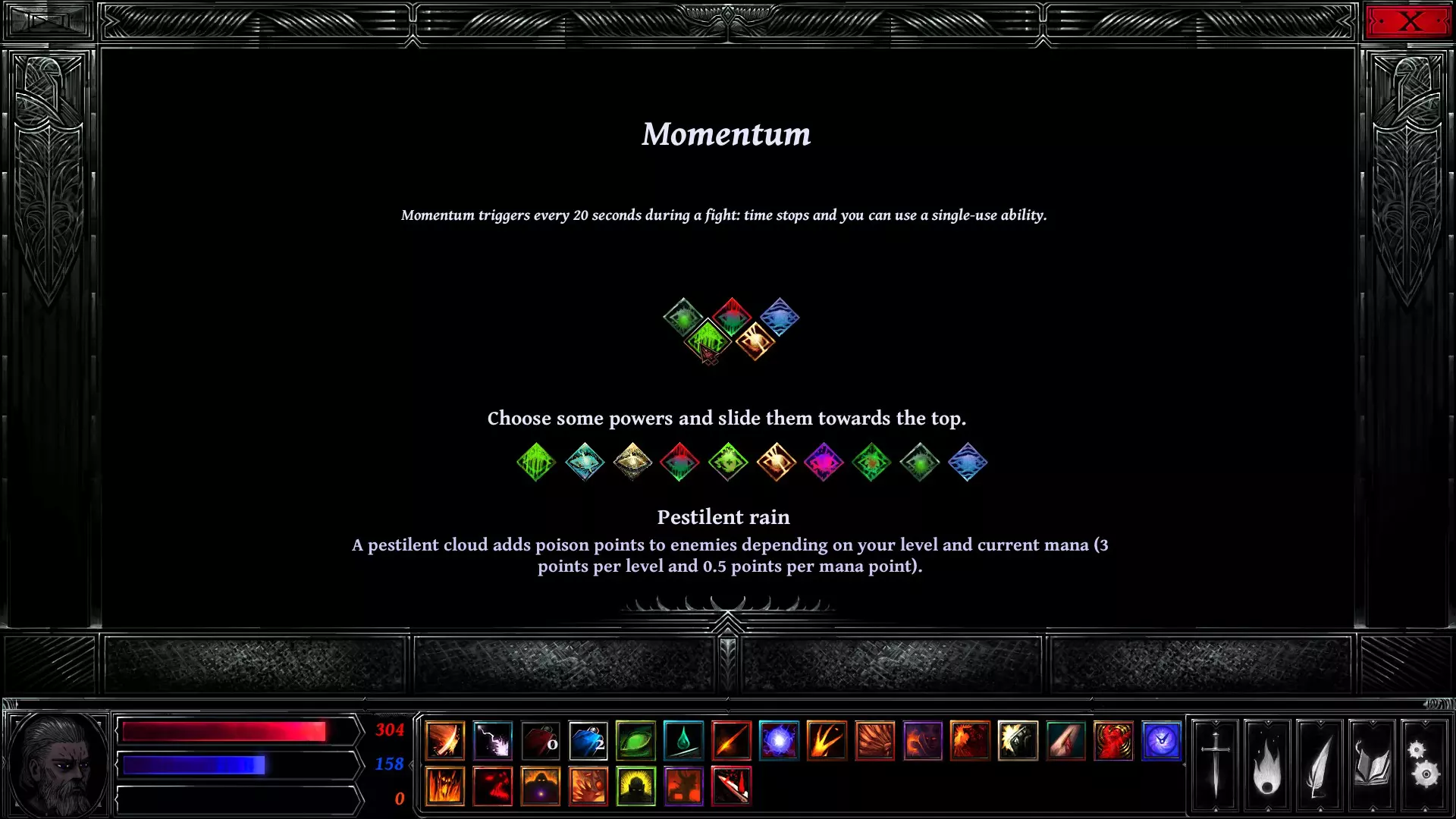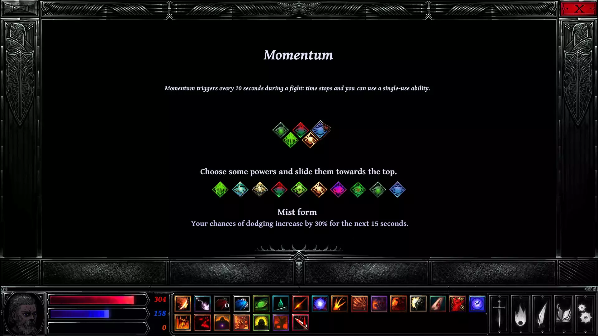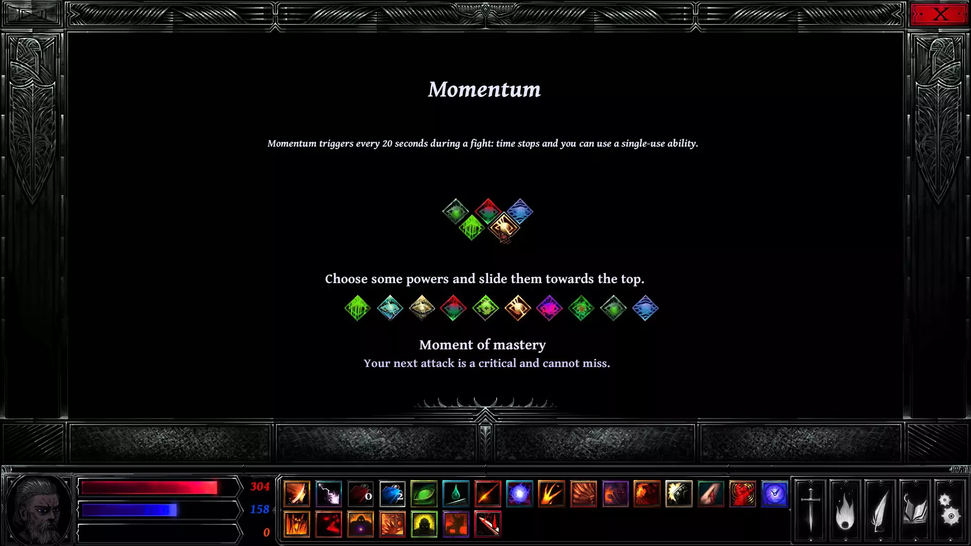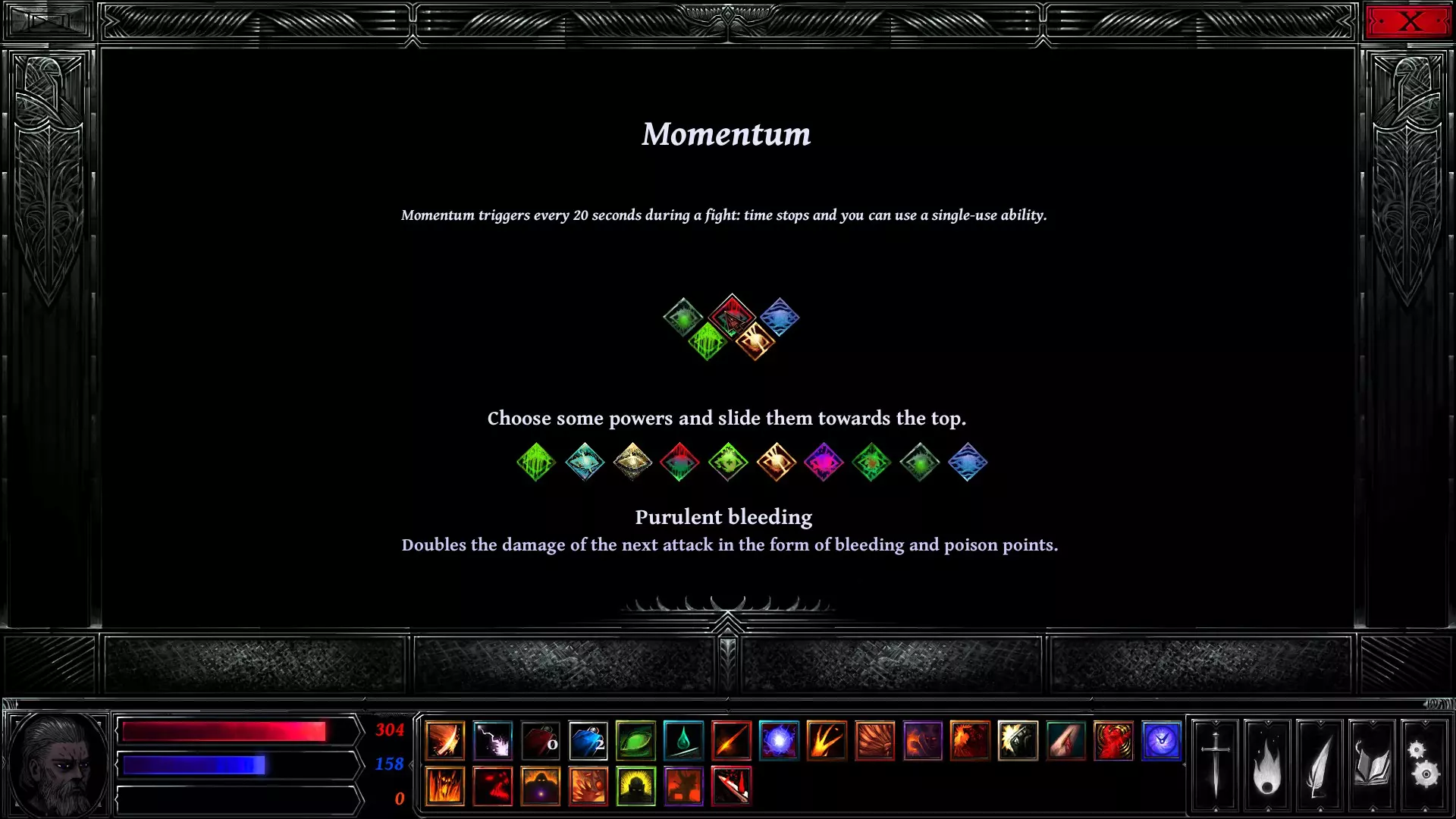 回合时间轴上那个中心镂空的大菱形被称为【动量图标】。当你的角色图标到达此处时,系统会提示你选择一项动量技能,具体取决于你在【能力>动量】栏位中装备的技能。在上方图片中,你将在4秒后开始你的动量阶段。中毒和流血