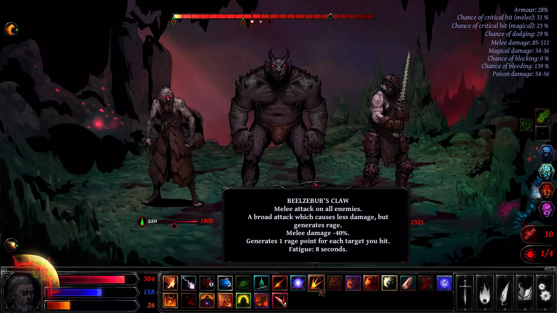 按以下顺序学习这些技能可获得最佳效果: 【幽界之毒】 为你的下一次近战攻击附加中毒伤害。仅可使用一次,但击杀敌人后可重新释放。 【阿斯蒙的爆发】 15秒内降低60%近战疲劳消耗。仅可使用一次,但恶魔形态结束后会重新充能。 【别西卜之爪】 近战伤害降低40%,但每击中一个目标获得+1怒气。 【末日之舞】 对所有敌人造成巨额伤害。仅可使用一次,但恶魔形态结束后会重新充能。 【撒旦之力】 使你的下一次攻击必定暴击。仅可使用一次,但恶魔形态结束后会重新充能。 【巴兰之击】 造成2倍近战伤害。 【打断】 为目标增加3秒疲劳值。如果目标将在接下来3回合内行动,则改为增加6秒疲劳值。击杀敌人后可再次施放 伤口恶化 使所有敌人身上的中毒和流血效果翻倍。仅可使用一次,但在恶魔形态结束后会重新充能 感染 施加等同于敌人当前流血层数的中毒效果。每个目标仅可使用一次 殉道者的临终哀嚎 仅在生命值低于30%时可用。恢复20%的法力值和怒气值。濒临死亡/生存模式下可再次施放 时间扭曲 使所有敌人获得7秒疲劳状态。濒临死亡/生存模式下可再次施放 别西卜之怒 16秒内,近战攻击额外生成2点怒气。濒临死亡/生存模式下可再次施放 巴兰的狂怒 15秒内,近战攻击变为横扫或双重打击。必定命中 专注 15秒内,近战和法术伤害提高25%仅可使用一次,但在恶魔形态后会重新充能 毁灭 必定命中。+30%伤害,此外每在本场战斗中造成一次暴击,额外+20%伤害。击杀敌人后可再次施放 赎罪 移除所有负面状态效果并恢复20%最大生命值。击杀敌人后可再次施放 衰败 为目标添加5秒疲劳状态。若目标生命值低于30%,则添加8秒。濒临死亡/存活时可再次施放 献祭给摩洛克 失去20%生命值,但下一次近战攻击提升25% 未出现在技能树中的技能 闪电 魔法伤害 巴尔形态 消耗恶魔点数