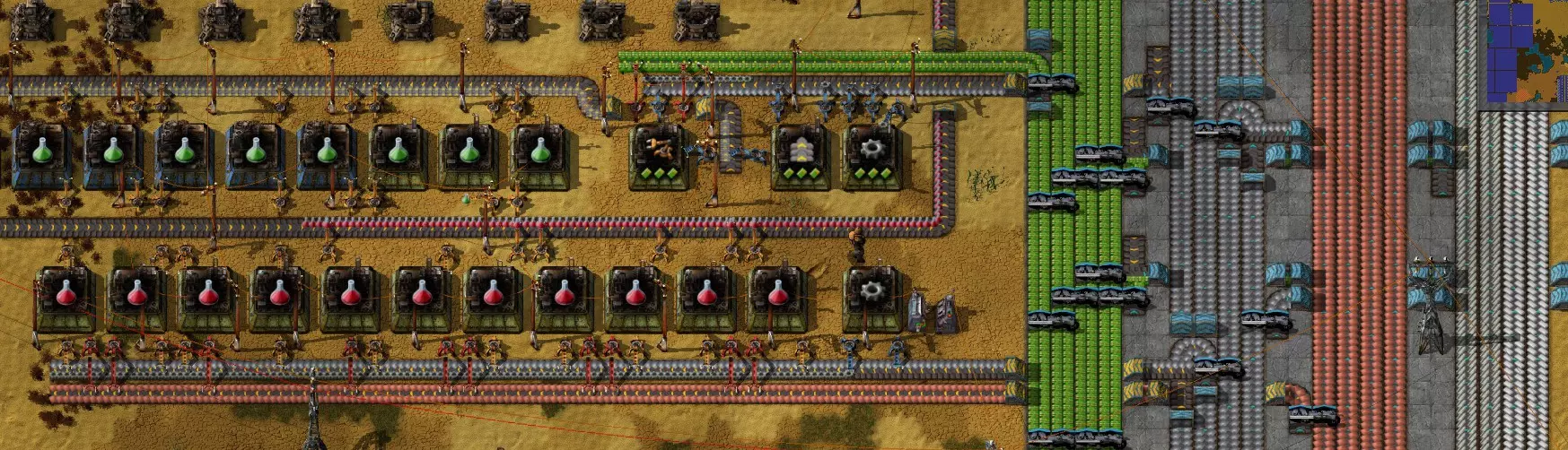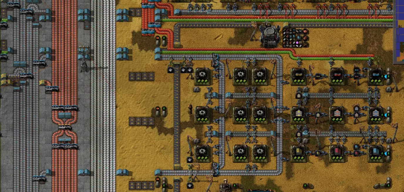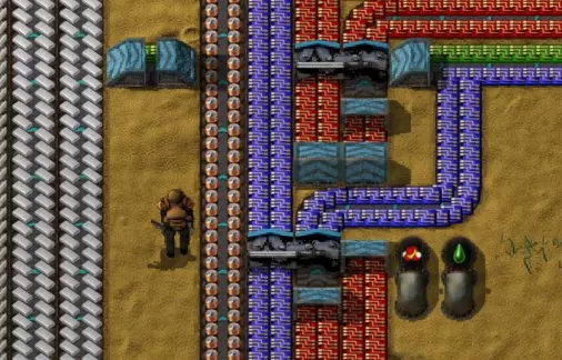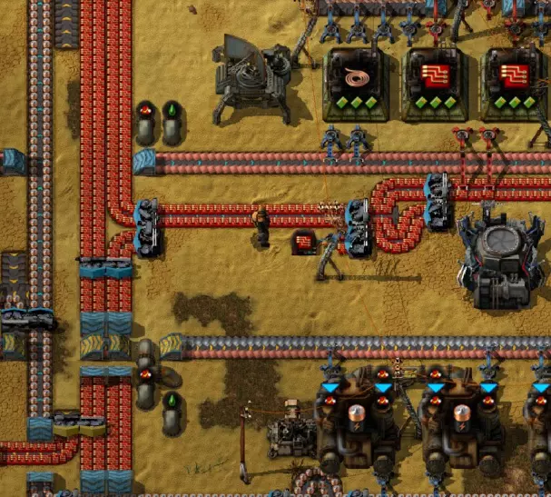 我的“嘎吱沙漠”工厂。我特意建造了一个南北向的总线,因为我总是被横向的总线困住!:-) 小贴士 为什么选择这些而不是那些? 铜缆:虽然它们对绿电路的需求量很大,但几乎不用于其他任何东西。用传送带运输它们也效率低下——1个铜板能制造2个铜缆,这使得对传送带的需求增加了两倍!最好根据需要在本地制造铜缆。 齿轮:虽然铁板与铁齿轮的比例在比例上很有利(2个铁板能制造1个铁齿轮),但我(通过实际实验)发现,在本地制造齿轮效率要高得多。齿轮的使用应有所节制,1个齿轮工厂足以满足一条装配线的需求。可以将其布置为:让铁板输入装配线的一半,齿轮则输入另一半(许多产品都同时需要铁板和齿轮)。 在需要大量齿轮的地方,例如传送带制造阵列,通过分流铁板现场制造齿轮会更便捷。通过主总线输送齿轮似乎总是供不应求,即便增加额外的输送道也是如此。 资源 关于《异星工厂》的其他参考资料: 官方游戏论坛——是寻找讨论和模组的好地方。 《异星工厂》维基——这里有大量有用的信息,是官方游戏网站。【信息】——包含大量关于比例等内容的信息。 《异星工厂》游戏指南——官方提供的优质教程。 《异星工厂》速查表——非常清晰的图解指南,涵盖比例、物品每秒产量等内容。 《异星工厂》数据查询——查找各类组件用途的绝佳工具,其“Factoratio”板块还提供几乎所有物品的比例信息。 结语