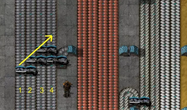 箭头指示物品的移动方向。在4号轨道分流后,分流器允许物品从1号轨道一直移动到4号轨道,为所有线路补充物品。 如果你的轨道长期不平衡,可以考虑安装一个合适的4轨道传送带平衡器,它能平均分配物品。