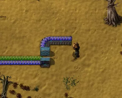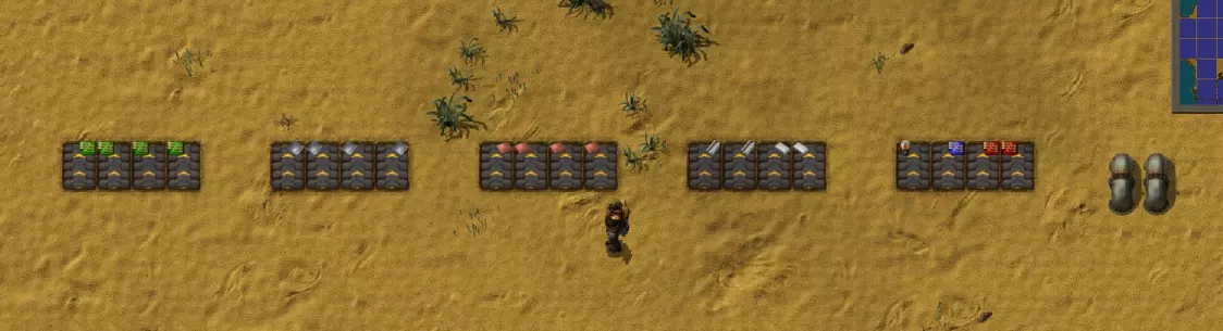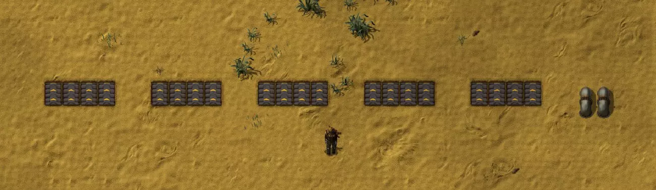 在传送带组之间留出空间,以便地下传送带穿过。记得为总线的液体部分添加管道! 初期无需建造所有传送带,只需为每条线路用一格传送带作为占位符即可……这样规划能让你知道装配机应该离线路多远。 你可以用一块材料标记每条传送带(如果你身上有的话)。要丢弃材料,先手持材料,然后按Z键丢弃。瞄准传送带!(或者使用常亮 combinator 并选择物品的符号)。