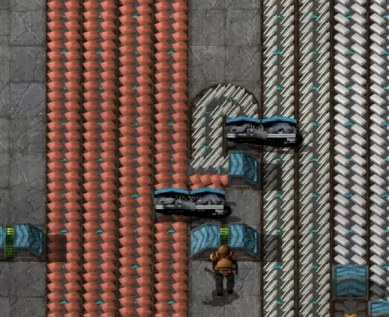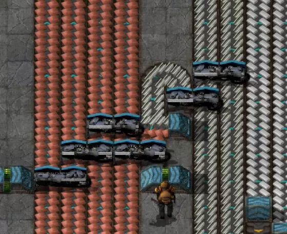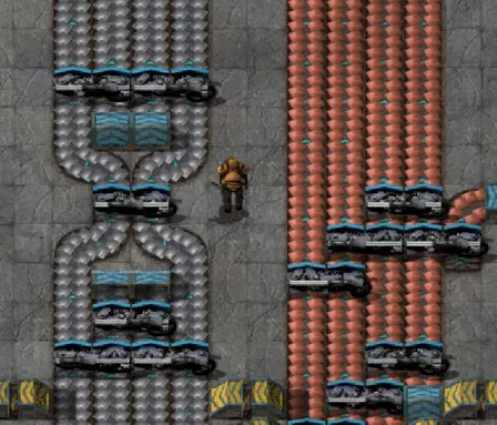 分流后的平衡:当你从主传送带分流后,需要重新平衡传送带,以便将更多资源送回你刚分流出来的那条主传送带。 在双传送带线路上(例如钢铁或塑料生产线),使用普通分流器即可。 在四传送带线路上,你需要确保离分流点最远的那条传送带能够向你分流的边缘传送带输送资源。因此,需要使用3个分流器将资源导回该主传送带。