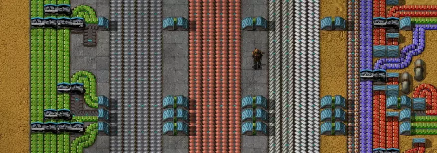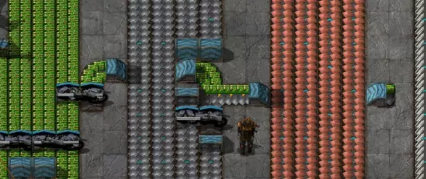 彩虹色的传送带将为你的工厂提供出色的吞吐量。 传送带结构 主总线设计有几种不同的结构可供选择。有些人会把所有传送带都放在一起,但我强烈推荐一种结构:4条传送带、2格间距、4条传送带、2格间距,以此类推,管道输送的物品放在一侧。 这种结构能让你轻松从一组传送带的侧面分流,留出放置地下传送带的空间,同时又足够紧凑,能让地下传送带不受阻碍地穿过。
