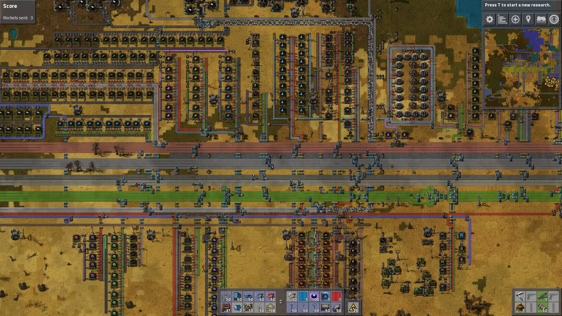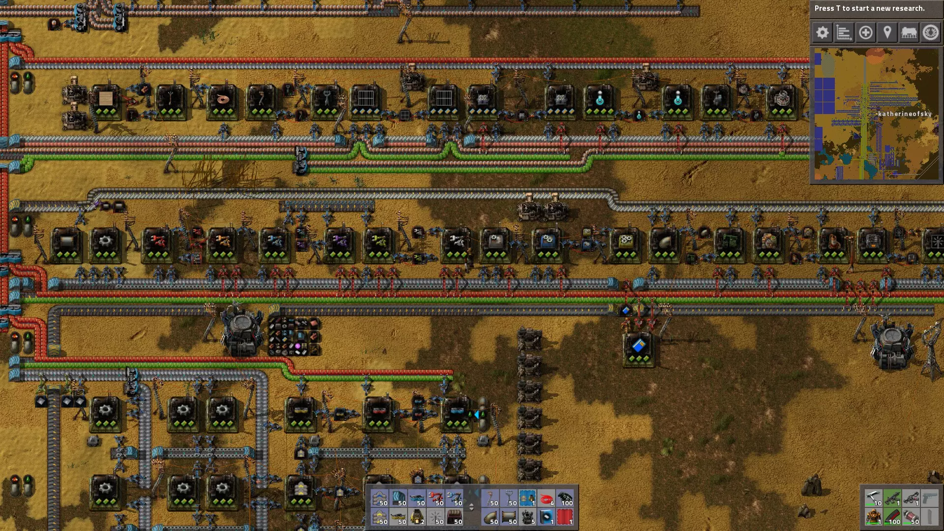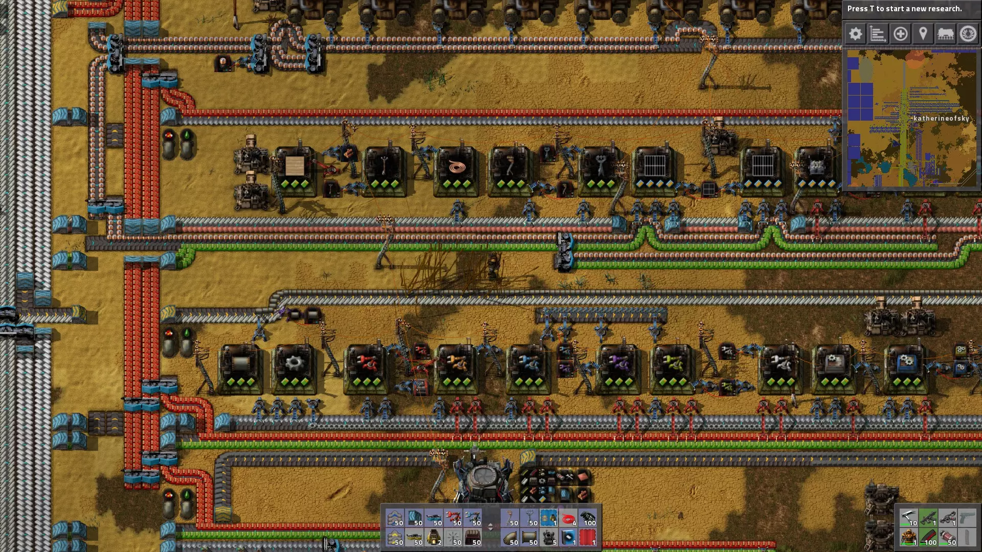 维护总线 确保在拆分传送带后重新平衡它们。 当需要更大吞吐量时升级传送带。(我通常跳过红色传送带,直接使用蓝色传送带,这样可以避免两次更换总线的麻烦)。 升级传送带最简单的方法是沿着线路移动,按住鼠标按钮在现有传送带上放置新的传送带。同样,只需将升级后的版本放在旧的分离器和地下传送带上,就可以替换它们(无需拆除)。 当拥有机器人后,可以使用蓝图轻松扩展总线。 增加更多生产设施,使传送带充满中间产品:铜 plate、铁板、钢、绿电路板等。在你的巴士线路的几条车道下方以及车道之间的至少一个空隙处铺设混凝土或石砖,因为这能提升跑步时的速度。 当你需要一种用于极少数物品的额外组件(例如石头、石砖或煤炭)时,可以从主巴士线路引出一条支线连接到装配机,或者通过机器人和请求箱运送材料。 科学与巴士:科学包的生产可以高效地从主巴士线路获取资源,从而形成一个可扩展的系统。 在这个设置中,我有64个实验室受益于主巴士的高吞吐量。另外,我将整个区域与工厂的电路分开布线,并通过电源开关连接,这样当研究完成时就可以将其关闭。