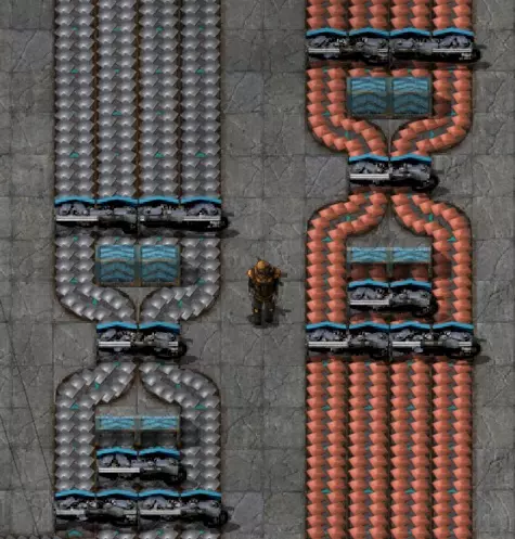一个合适的4车道传送带平衡器(用于铁),可将物品平均分配;旁边是节省空间的解决方案(用于铜),这是在空间不足时的权宜之计。 另一个从主传送带分流两种物品的示例: