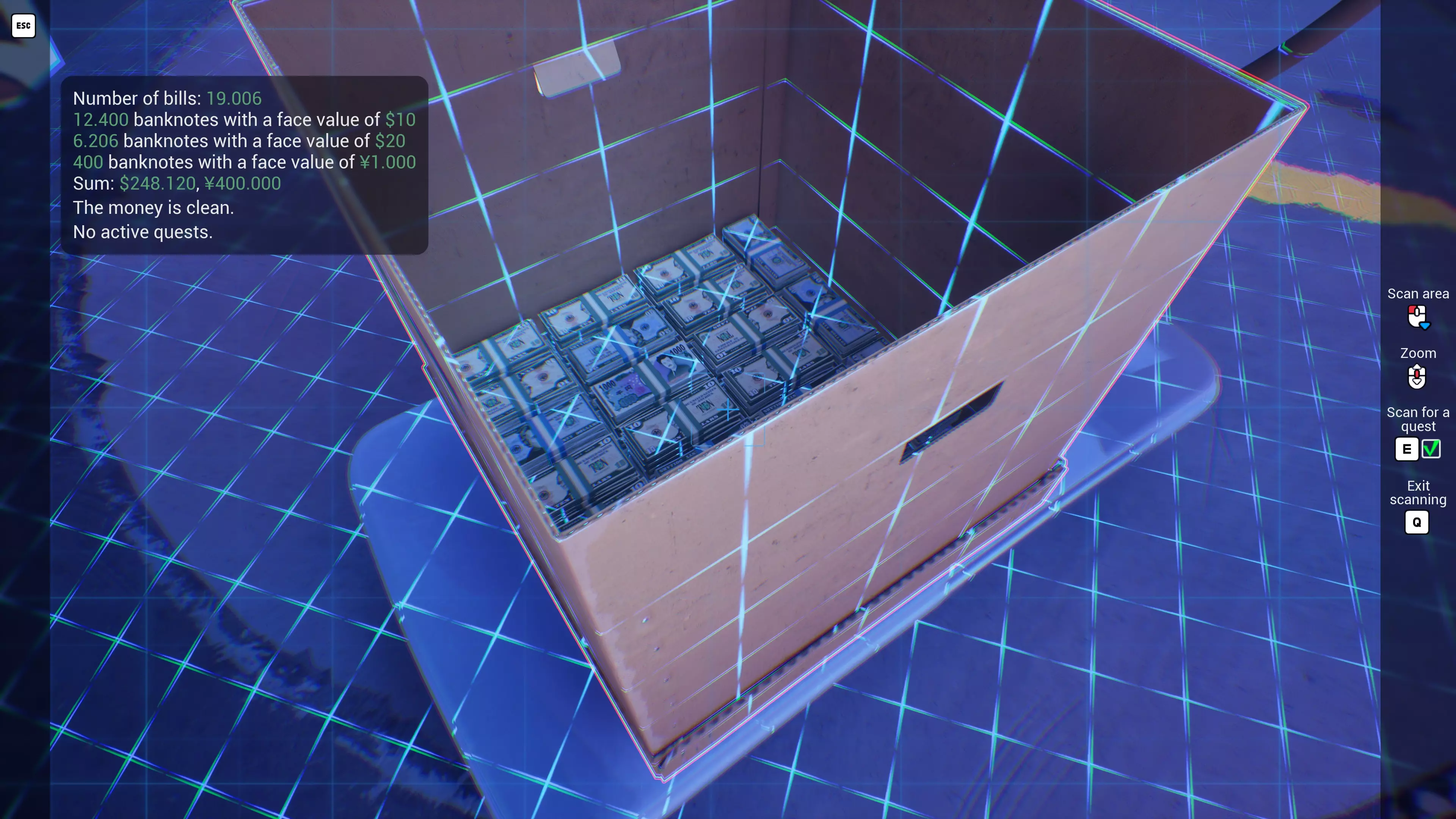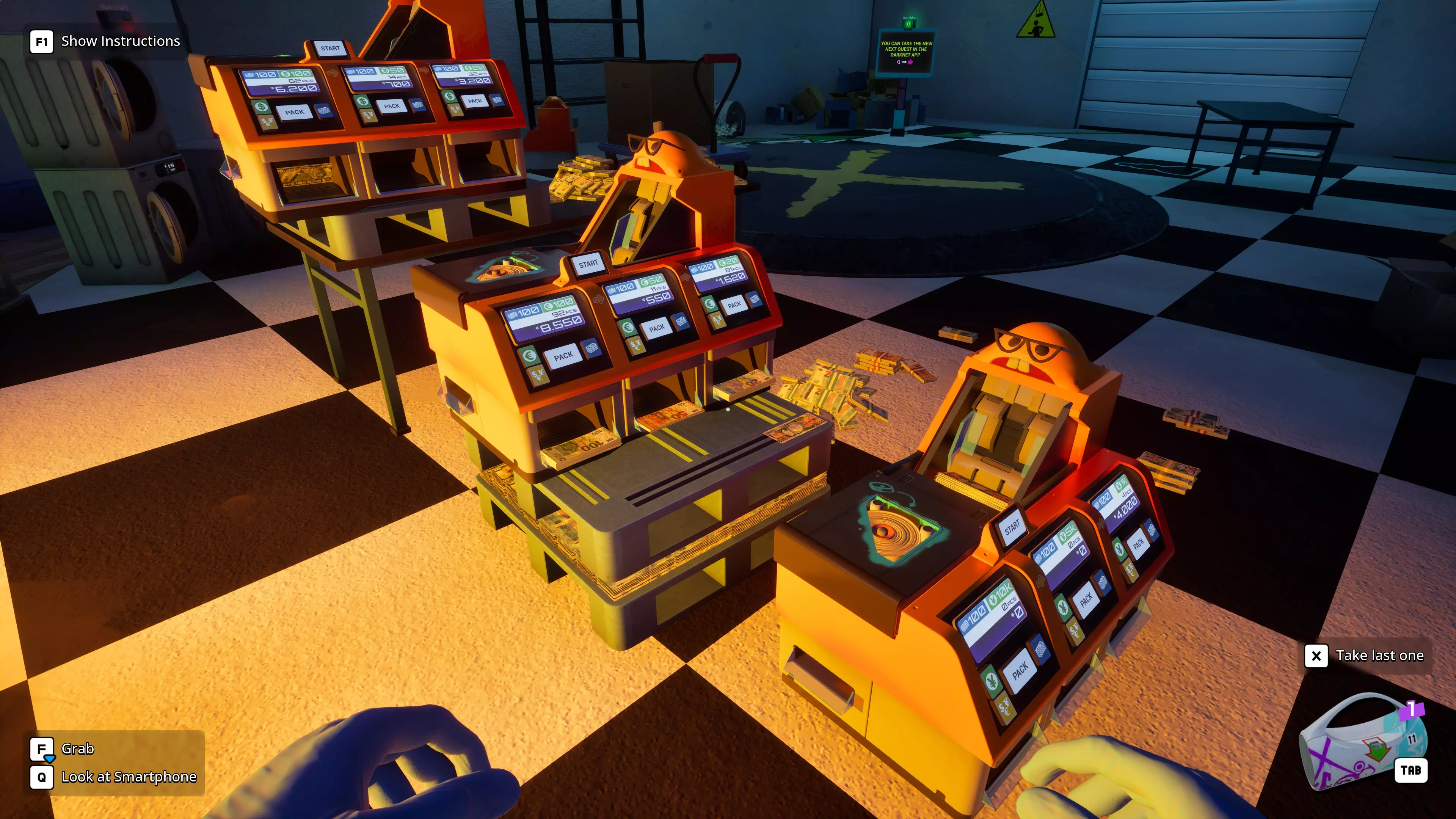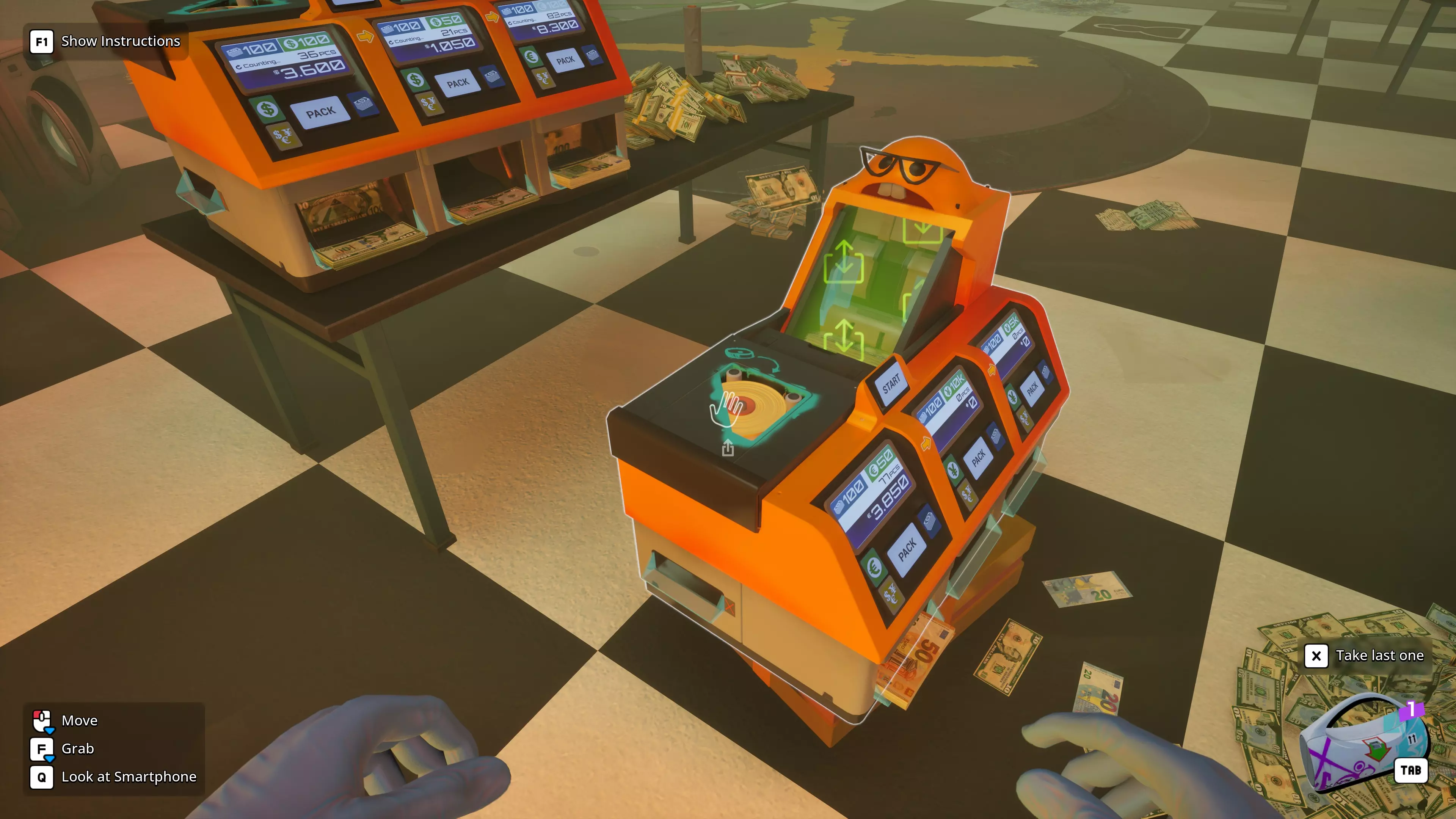 How to go through the game efficiently, ingame tricks and avoiding the softlock quests Money (and Supply) mechanics Left click a bill to pick it up. Once you have two in hand, you can hold M1 to automatically pick up more bills and ONLY bills - this filter mechanic also works for trash. You can pickup up to 100 into a neat STACK. As soon as you pick up a second "trash" item, they merge and turn into a trash bag which can only pick up more trash. The bag has a max capacity. Use F to sweep up loose bills that are spread out. This can yield up to a full HANDFUL. If your first F only hit bills, your subsequent F will filter only for bills. This is useful for cleaning messes. Caution, if non-bill items are in your first F sweep, you instead just grab a handful of random stuff and no filtering happens. Loose bills on the map combine into a PILE automatically once 101 are lying close together. From a PILE, you can no longer grab single bills. Holding F and left clicking a PILE gives you a HANDFUL (300) of the bills. Note this may be less than the max amount if the PILE contains less than that. Long left clicking a PILE grabs up to 100 bills in a neat STACK, however the stack is not sorted by bill type. Still useful for the "150 bills" quest. With a STACK in hand, holding M2 and pressing X allows you to drop single bills, which is useful when you need less than 100 or when getting the basketball achievement. You can carry an infinite number of bills in your hands using the SPHERE grab. First grab a HANDFUL, then hold M2 and touch more money with it. It vacuums it up and turns into a SPHERE which does not appear to have an upper limit. If you try to overfill a money counter or a washing machine, the bills that don't fit burst away explosively. Avoid doing this, as they may fly into sorted PILES and contaminate them. Grabbing loose bills from a container yields a more loose HANDFUL which will not cleanly insert into counters - drop it on the ground first and re-grab with F for a compact HANDFUL. Wet bills will eventually dry on their own, even when bound in stacks. Unsure about plastic The Dryer does not have an upper limit on how many bills it can handle. The Washing machine can be used to separate bills from items - if you grab cash out of a washing machine with F, trash, items and coins separate away and fall to the ground. The Washing machine also breaks open any money packs. It is possible for the machine to become severely overfilled because of this - you may have to use F many times to empty it after. Ink and Dirt can spread from one bill to others. Never mix inked or dirty bills with clean ones. Dirt is washed off in the washing machine, ink can technically be scrubbed off on the worktable. But it isn't worth the time investment. Feed inked bills to the pig. Always open treasury bags with the knife, never by hand. You wont see ink that way, ever, until you reach the endgame vault. Dollars have 4 bill types which is one more than the XXL Counter can handle. Euro and Yen however only have 3 bill types. Once in midgame, coins start to appear in tasks. Filter them out with the washing machine and keep them. Tasks ask for coins rarely. Picking these up into a stack with M1 grabs 20 coins, which is helpful when counting them for an order. Your full packed money packs are color coded, but incoming pack straps may lie! Incoming packs may be incomplete or have mixed bills. Supplies and hand tools: Tape and plastic combine with themselves! Pick up one, left click another, and they merge. Plastic is almost never asked for, and the initial supply should last your entire game. Tape however, you should buy in bulk of 20-30, combine them into one, and keep them on your table until you run out. The game recommends you keep tools in your bag, which is clunky. I recommend you only keep the knife on you so you can whip it out with X. You need it to cut open packs before you have the washer, to open treasury bags, locked cases, and to cut mattresses. Leave tape and plastic on your working table, near the money counter - you can quickly use them if needed. Tools and the Worktable You get a bunch of free stuff in early story tasks (the yellow ones): a shopping cart a bunch of tape and plastic a knife a Dryer a Washing Machine a Ladder Another story task makes you buy the first money counter, which isn't free but you still have it after. When the map expands into the area with the pig, the "upper area" you can pay to access contains 2 more Washing machines. This area also contains the worktable on the left. You should buy all the worktable upgrades in the shop as soon as you can, they cost almost nothing. When the map expands into the vault, you can find a small UV lamp inside on the right, as well as a Trolley. Since using UV light is super annoying (you need a dark area), i recommend only using the one on the worktable. Counterfeits are sorted out by any money counter above the basic one, and for marked bills i would suggest just ignoring them altogether until the vault quests. Just add some extra cash into the deliveries to hit the goal amount for sure. Picking out single marked bills is a gigantic waste of your time and never worth the effort. The vault quests near the end do force you into it, however. As mentioned before, washing machines can automatically break open packs and help sort out trash. You can stack multiple washing machines on top of each other, if you overfill the topmost one the one below may suck in the falling remains. A washing machine has a limit of 300 or slightly more objects, it can always take a full HANDFUL. You only need the one dryer as it can handle an infinite pile size. Money Counters The basic money counter cannot spot counterfeits, which also means it is the only counter than can sort counterfeits. The basic and L models spit out bills in an arc, which means you can technically daisy chain them. But it is largely unhelpful and i didn't do it. You should keep leveling to get t