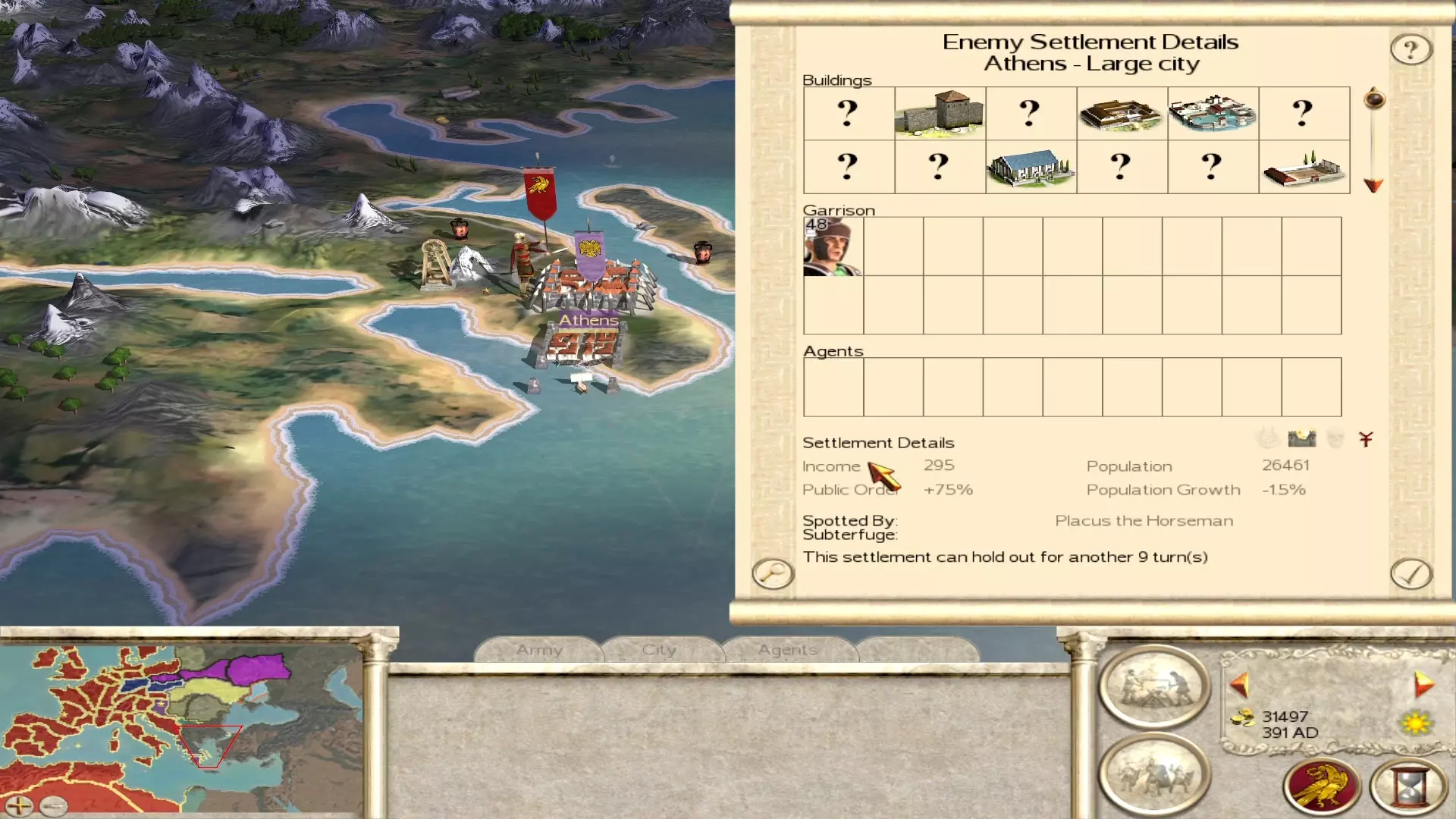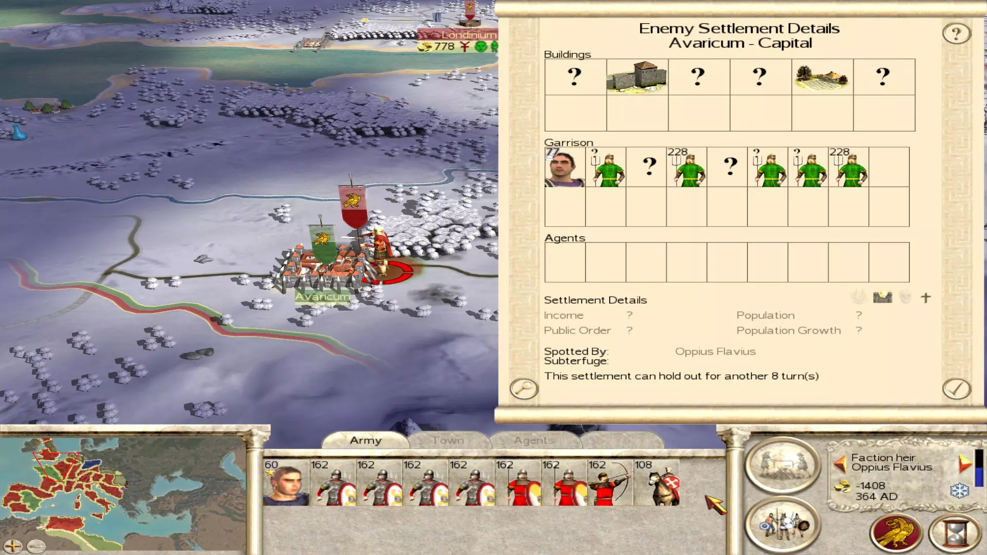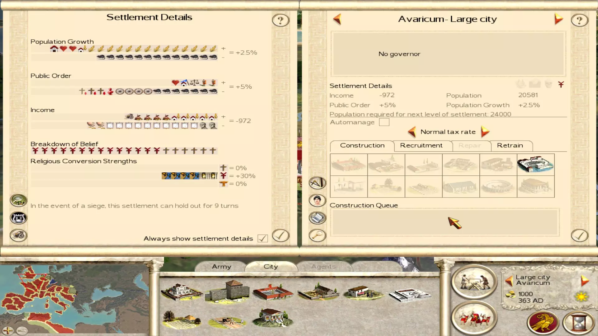 战役开始时阿瓦里库姆的公共秩序。即便队列中有农民且税收较低,这里的叛乱也无法阻止。 为了应对即将爆发的叛乱,你需要找出问题城市(如上所列)并执行以下操作:在第一回合将所有军队撤出这些定居点,将税收调至极高,并摧毁所有军事建筑。设置极高税收能略微加快暴乱进程,同时在城市叛乱前榨取最后一分钱。摧毁军事建筑不仅能获得一些额外资金,更重要的是能帮助你在城市叛乱后轻松夺回它。